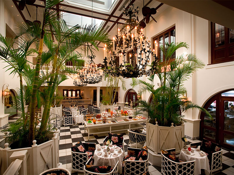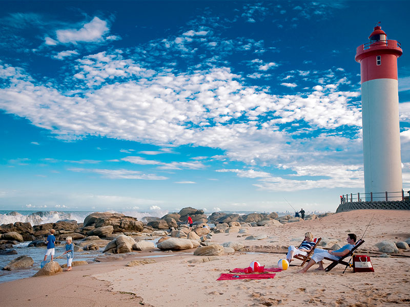 Het prachtige, geheel gerestaureerde Oyster Box hotel is met behoud van alle originele details en een combinatie van de originele antieke meubelen overgoten met een modern sausje, naast de rood met witte vuurtoren, het herkenningspunt van Umhlanga (vlakbij Durban).