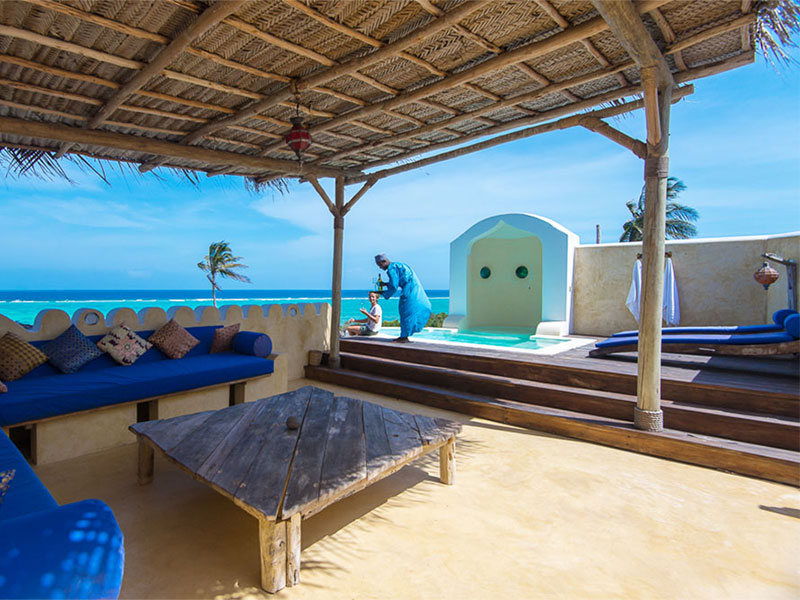 The ground floor (150 m2) features a one bedroom, bathroom with bath and shower, and a large veranda with bar. As you sit in a large romantic bath, you have a view over the Indian Ocean. There is a terrace (partially covered) on the top floor with a plunge pool. If that still isn't enough, each villa has a private beach front. The chef comes daily to discuss your lunch and dinner preferences. Massages and beauty treatments are possible in your villa or on the terrace.