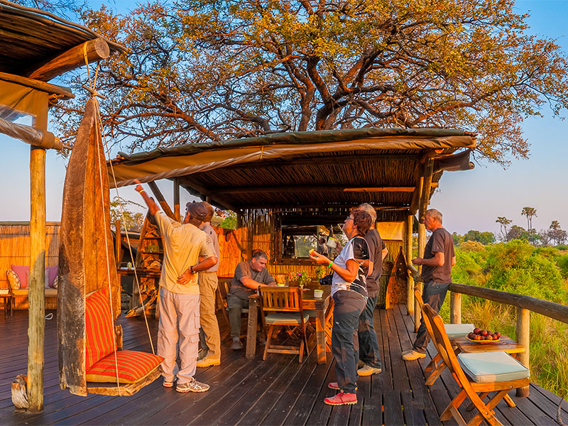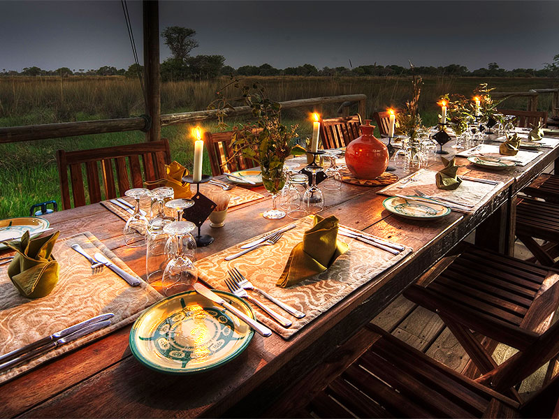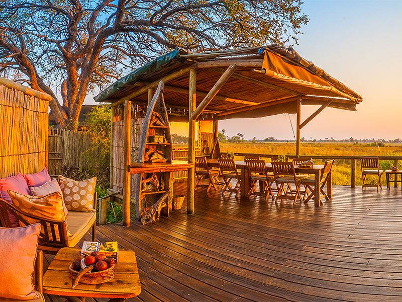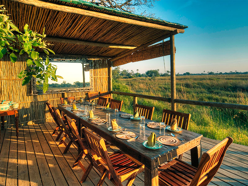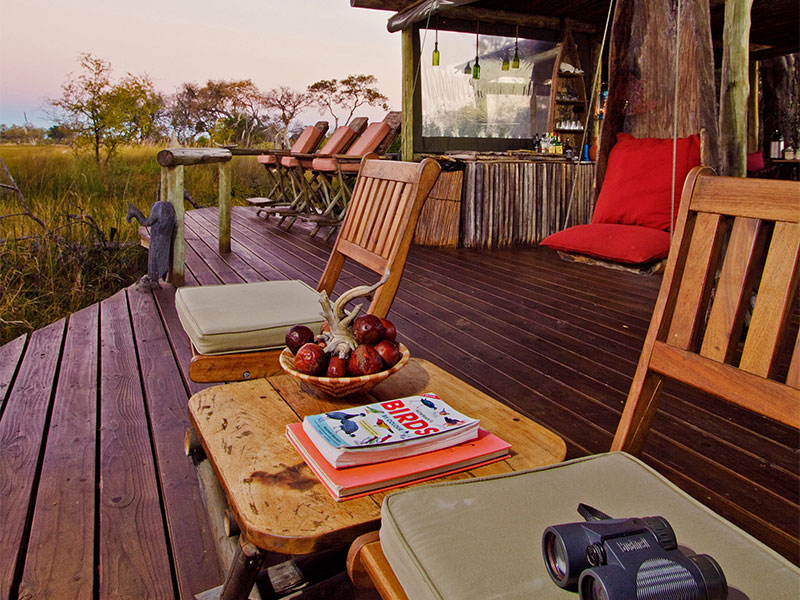 The guest areas have a variety of comfortable seating and a raised viewing deck overlooks the sweep of the Delta – the perfect place to watch the sun or moon rise and view whatever wildlife may be visiting. Meals are enjoyed on the deck with spectacular views across the floodplains to distant island forests.