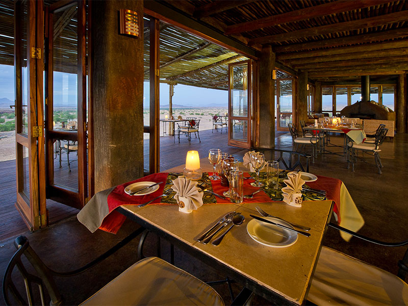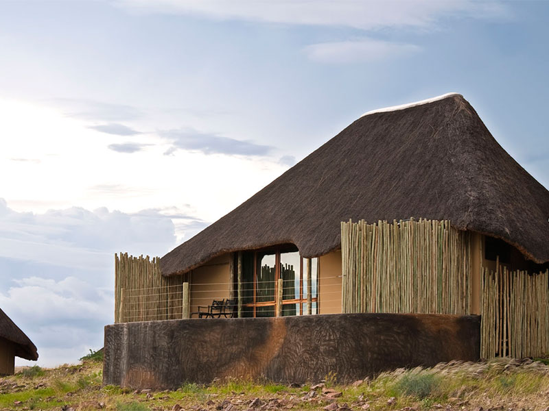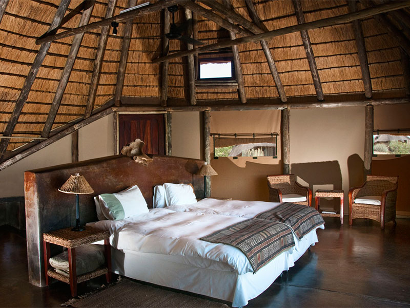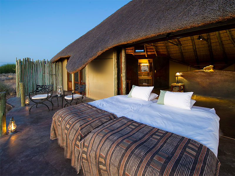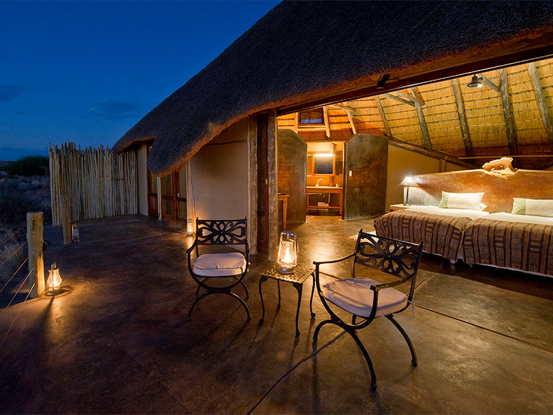 Elk van de 16 cottages heeft een veranda die een prachtig uitzicht biedt op de omgeving, met behoud van uw privacy. U kunt kiezen of u binnen of buiten wilt slapen… Er zijn zowel binnen- als buitenmogelijkheden om te dineren, een zwembad, bar en kleine gallery met Namibische kunst.