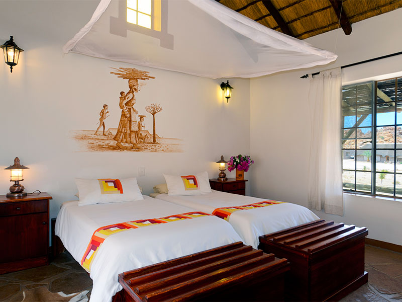 De in totaal 24 chalets, gebouwd in 2003 in Cape Dutch-stijl, zijn het resultaat van het combineren van natuur en comfort. Alle rietgedekte kamers zijn voorzien van een badkamer met douche en toilet. Op de kleine veranda voor uw chalet kunt u heerlijk van alle zonsop- en ondergangen genieten. Het hoofdgebouw bestaat uit een gezellig restaurant, een bar, een groepskamer, souvenirwinkel en een beer-garden.