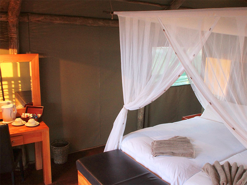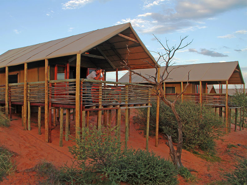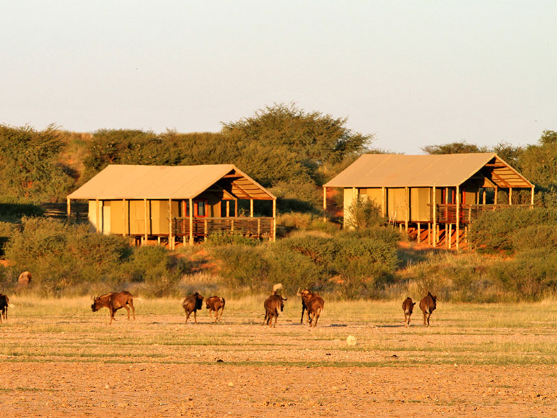 Het kamp bestaat uit 12 luxe tenten, verborgen in de Kalahari savanne. Elke tent beschikt over comfortabele bedden, een privé veranda, een badkamer met warm en koud stromend water, een douche en een toilet.
