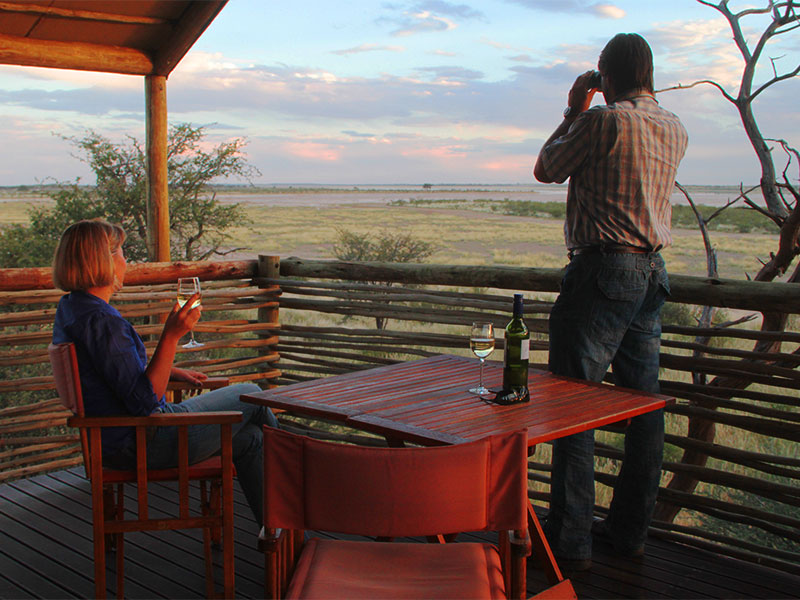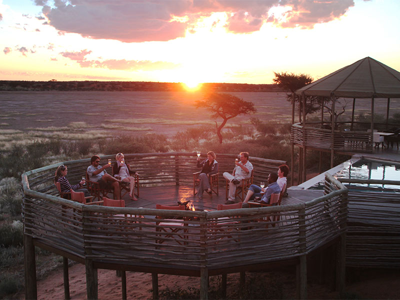 Een gezellige lounge in Afrikaanse stijl met uitzicht over de uitgestrekte grasvlakten van de Auob rivier of de veranda bij het zwembad is de perfecte plaats voor een drankje en een maaltijd.
