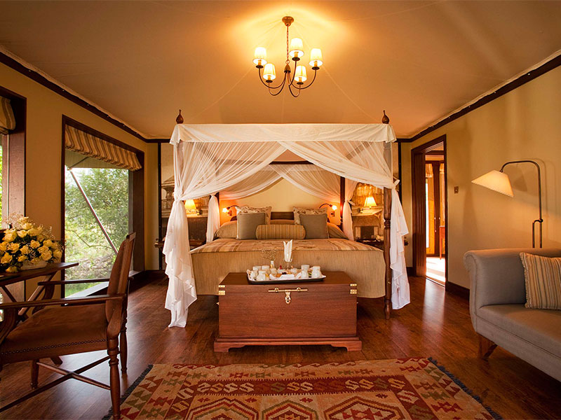 De 24 luxe tenten zijn zeer ruim en smaakvol ingericht voor privacy en comfort met een decor dat de natuur tot zijn recht laat komen. Na een lange dag kunt u ’s avonds genieten van de heerlijke gerechten uit de keuken in de sublieme eetzaal van het kamp en u ervaringen delen met andere reizigers. Voor ontspanning kunt u genieten van heerlijke massages en schoonheidsbehandelingen of u kunt een frisse duik nemen in het zwembad waar de sportieveling eventueel deel kan nemen aan aqua-aerobics.
