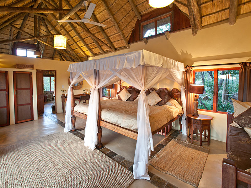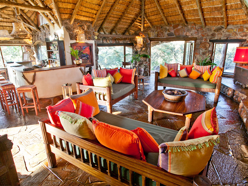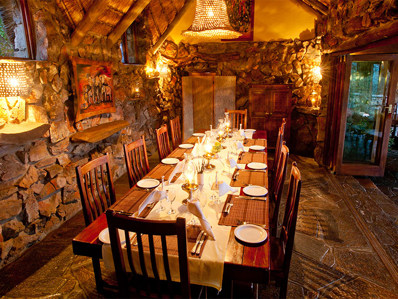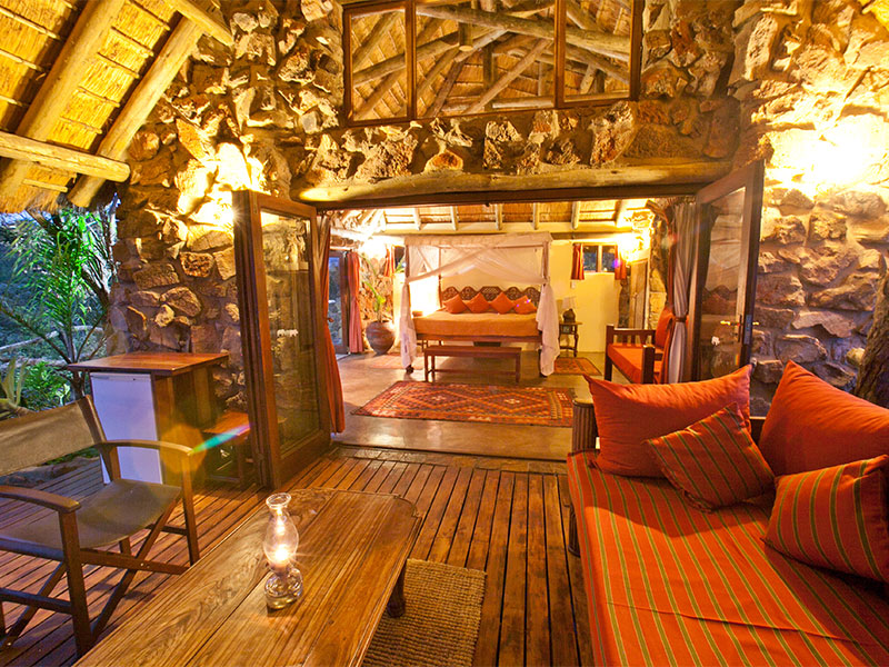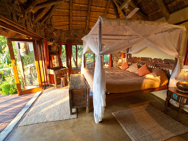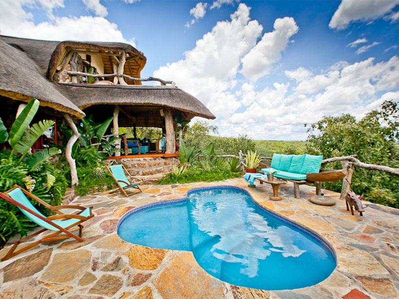 De rietgedekte lodge (maximaal 12 personen) ligt verscholen tussen de bossen. Het beschikt over een bibliotheek en een souvenirwinkel. De ruime kamers met openslaande deuren naar een schitterende veranda, zijn in Afrikaanse stijl ingericht en zijn van alle comfortabele gemakken voorzien. U kunt heerlijk relaxen in het verwarmde zwembad, dat tussen de rotsblokken van de klif ligt. Het water stroomt over de rand in een ravijn.