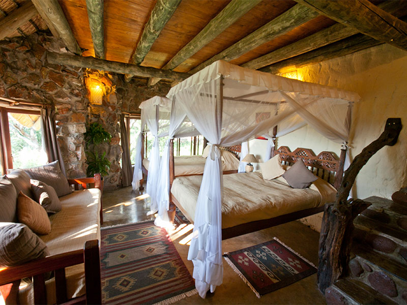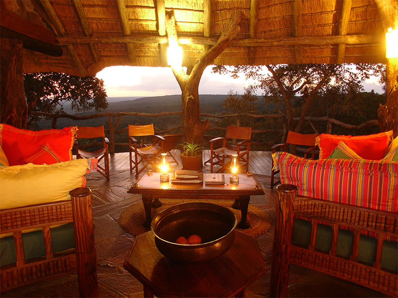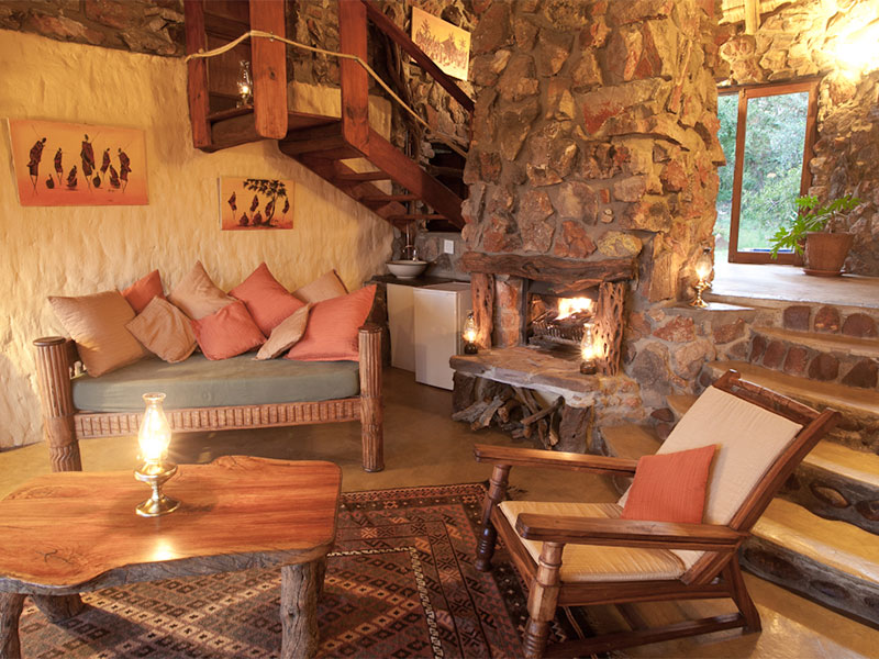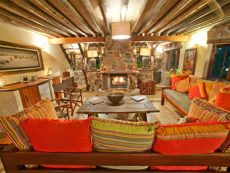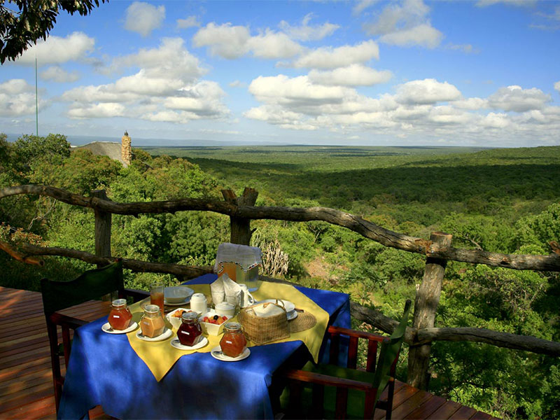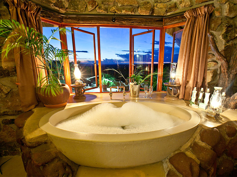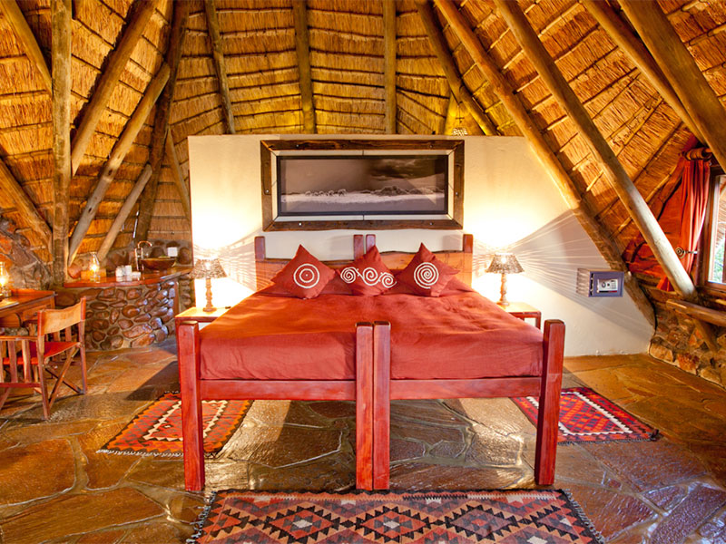De rietgedekte lodge (maximaal 12 personen) ligt verscholen tussen de bossen. Het beschikt over een bibliotheek en een souvenirwinkel. De ruime kamers met openslaande deuren naar een schitterende veranda, zijn in Afrikaanse stijl ingericht en zijn van alle comfortabele gemakken voorzien. U kunt heerlijk relaxen in het verwarmde zwembad, dat tussen de rotsblokken van de klif ligt. Het water stroomt over de rand in een ravijn.