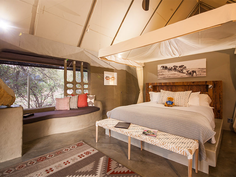 De 6 luxe tenten hebben en-suite badkamers en zijn opgebouwd uit muren en canvasdoek. Elke kamer heeft een mooi uitzicht vanaf zijn eigen privé terras (met hangmat) met uitzicht op onder andere de 'waterhole'.