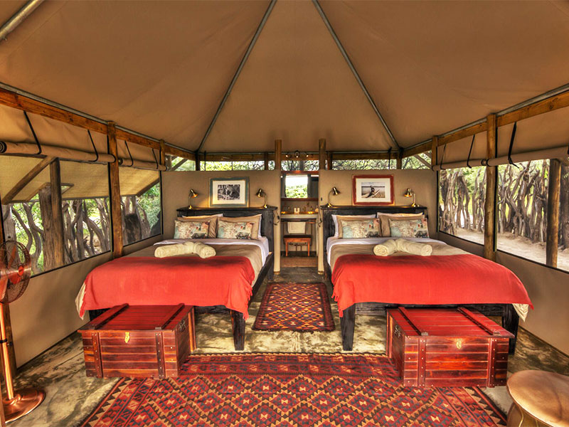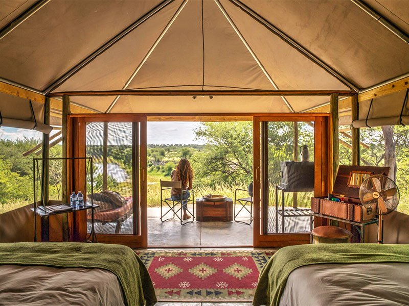 De in totaal 10 tenten staan op de oevers van de sinds 1995 droge Boteti rivier. Elke tent heeft een eigen badkamer met een ‘bucket shower’, een toilet en een veranda. Uiteraard heeft u vanuit elke tent een schitterend uitzicht over de omgeving.