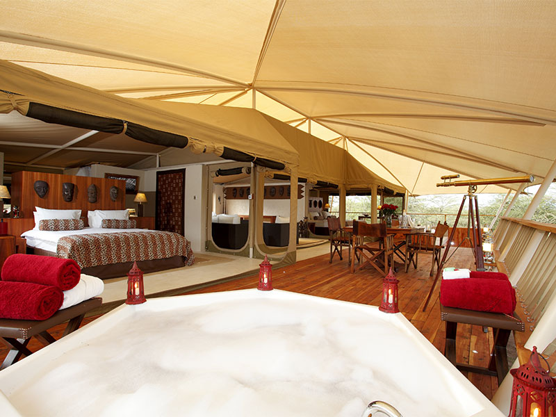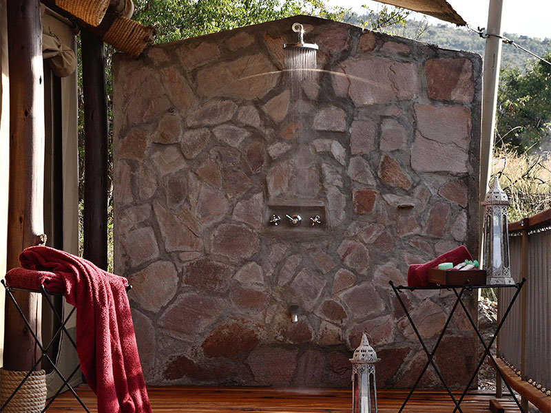 De slechts 12 ruime luxe ingerichte safaritenten (100 m2) zijn van alle gemakken voorzien, zoals een badkamer met douche, toilet, buitendouche en privé veranda met zitje, ligbedden, telescoop en een 'hot tub'.