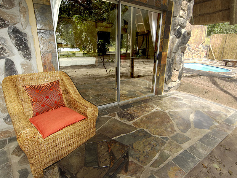 De stenen en-suite chalets met rieten dak (waarvan sommige met een privé dompelbad) zijn gesitueerd in de schaduw van de hoge bomen met uitzicht over de rivier. Alle chalets zijn eenvoudig maar smaakvol ingericht en hebben klamboes, plafondventilators, koffie- en theefaciliteiten en een en-suite badkamer met douche en wastafel, sommige met bad.