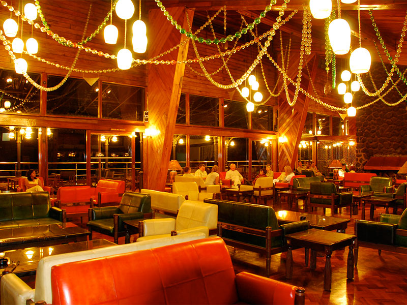 Er is een gezellige lounge met open haard waar u tijdens de koude avonden kunt zitten. Vanaf het brede terras voor de bar en het restaurant kunt u met een verrekijker prachtig de krater inkijken.