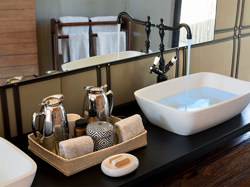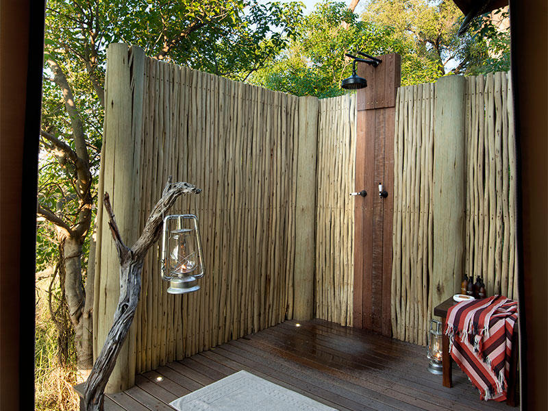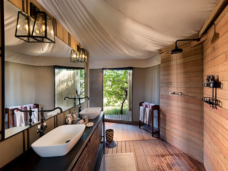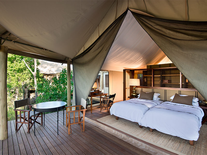 De 9 luxe, stijlvolle, in Oost Afrikaanse stijl ingerichte safaritenten staan op een verhoging en zijn voorzien van een privé veranda en-suite badkamer met douche en toilet. Verdere faciliteiten van Nxabega zijn een uit lokale materialen opgetrokken hoofdgebouw met lounge, restaurant, cocktailbar, wildlife bibliotheek en een safari shop. Even verderop vindt u de traditionele boma, waar regelmatig het diner wordt gebruikt in de open lucht bij het kampvuur. Voor verkoeling is er een zwembad aanwezig.