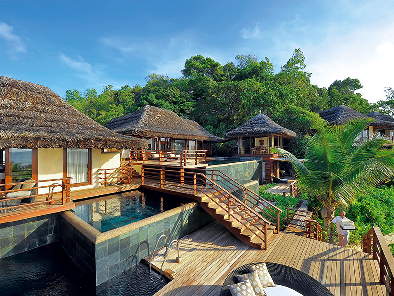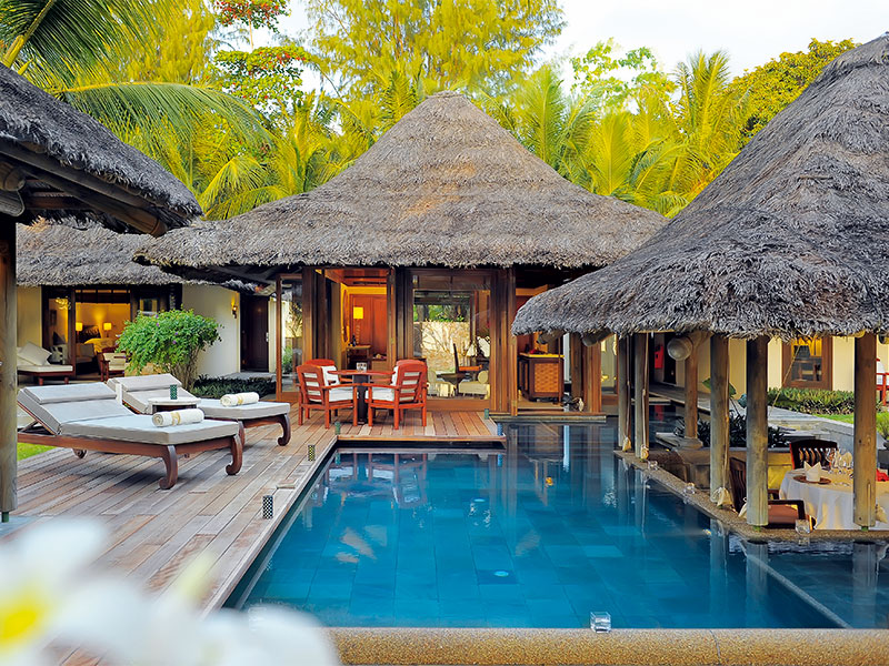Op het strand gelegen villa's (725 m²) met 2 kamers, lounge, een maaltijdruimte die op het privé-zwembad uitkomt, ontspannings- en massagepaviljoen, Sony Playstation, bad en douche in de open lucht.