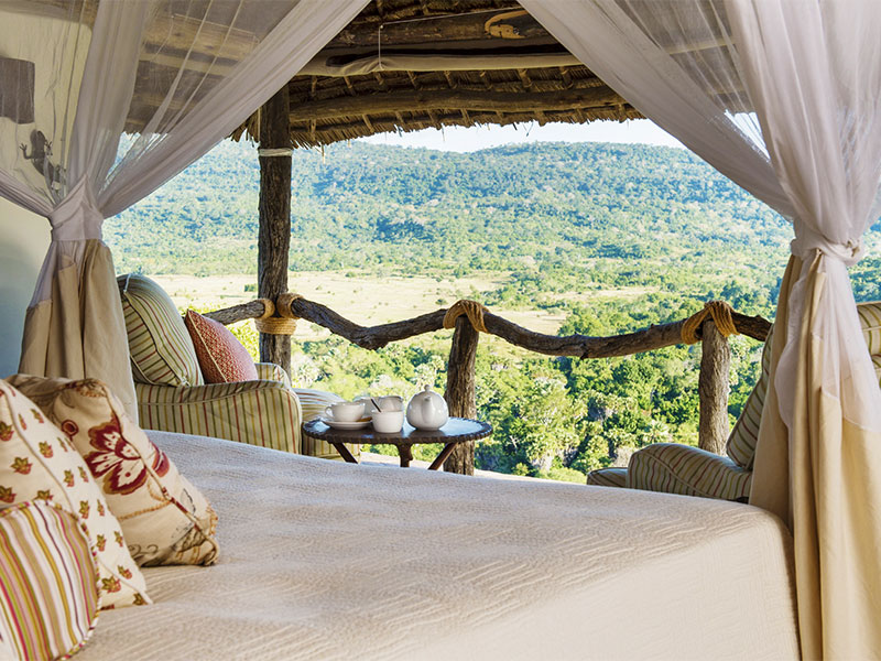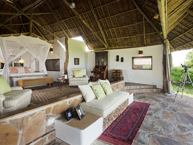 Het gevoel van ruimte wordt versterkt door het feit dat het hoofdgedeelte van de suite geen voorwand of ramen heeft, maar geheel open is naar de veranda, met een prachtig uitzicht over de wildernis van Selous.