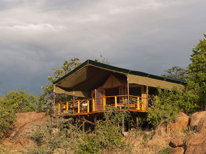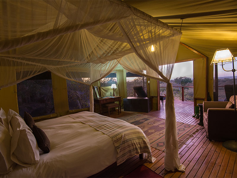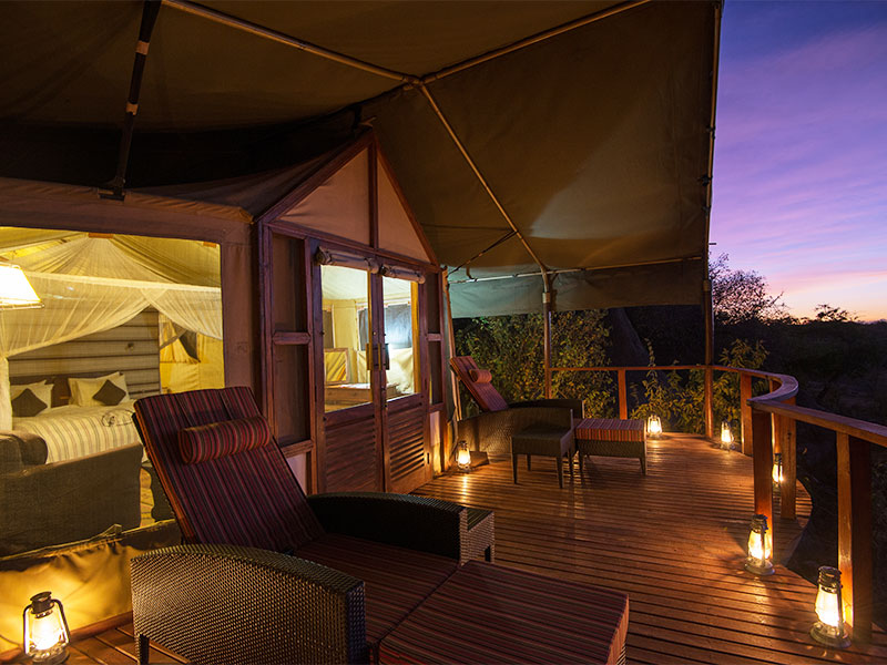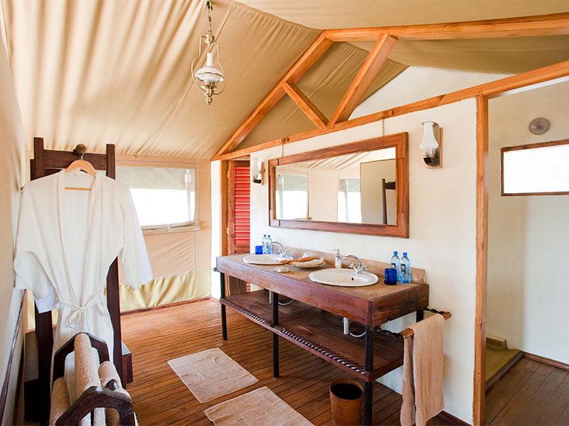 Het kamp bestaat uit slechts 12 ruime tenten (48 m2) die veel privacy bieden. Elke tent heeft een badkamer en-suite met dubbele wasbakken en een douche en een ruime veranda om bij het krieken van de dag, of bij het vallen van de avond, optimaal van de omgeving te kunnen genieten. Uw persoonlijke butler begeleid u indien gewenst van uw tent naar de algemene ruimte.
