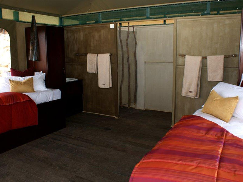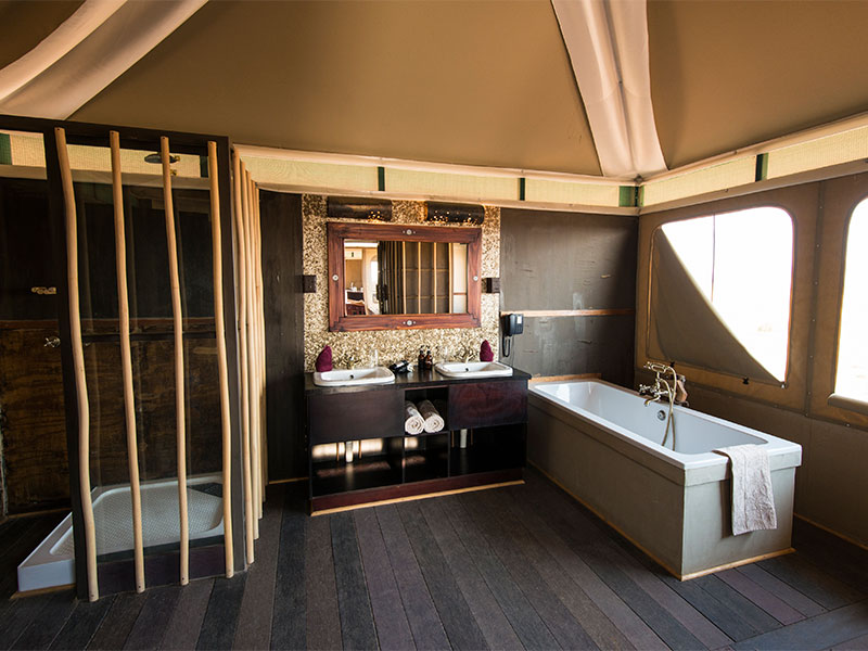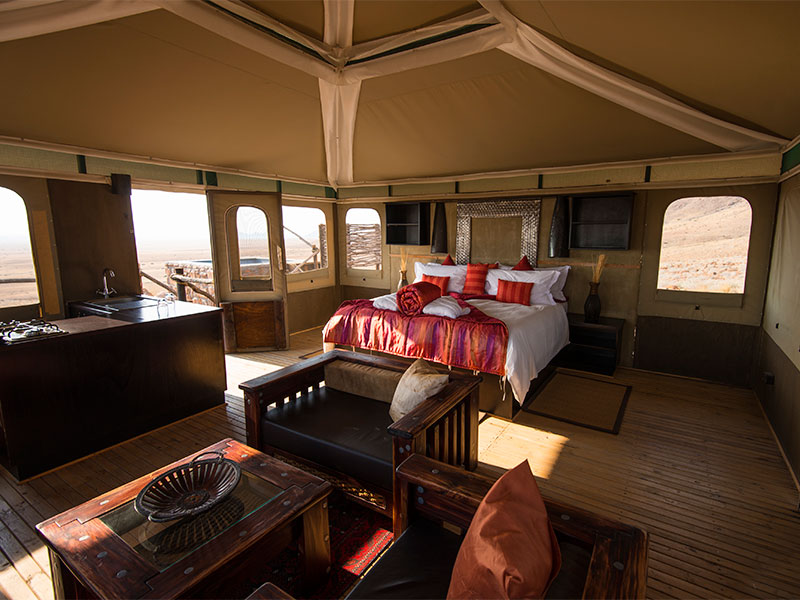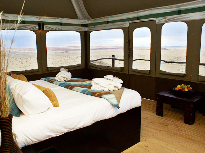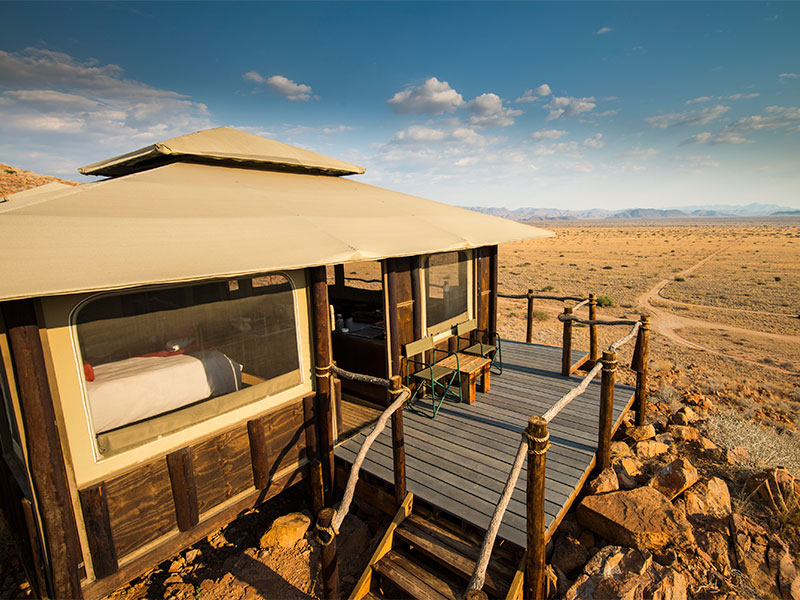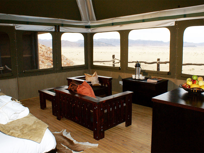 Alle luxe tenten staan op houten platforms op palen en bieden een adembenemend uitzicht over de Namib woestijn met haar prachtige bergen, duinen, springbokken, oryx, mountain zebra’s en vogels. Alle 11 luxe tenten zijn voorzien van een en-suite badkamer met douche, een koelkast, telefoon en een privé veranda met een dompelbad. De 6 suites hebben ook nog een lounge.