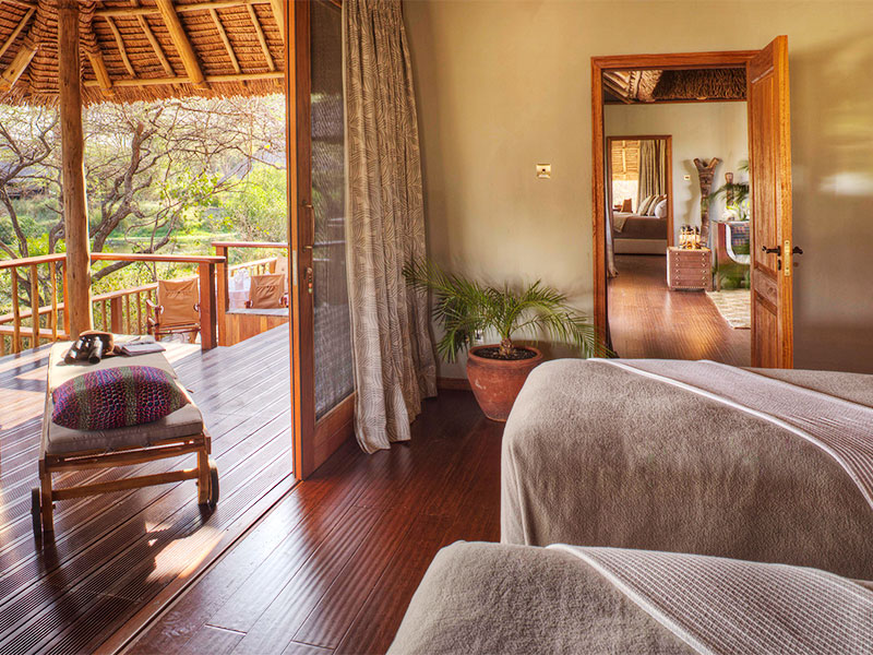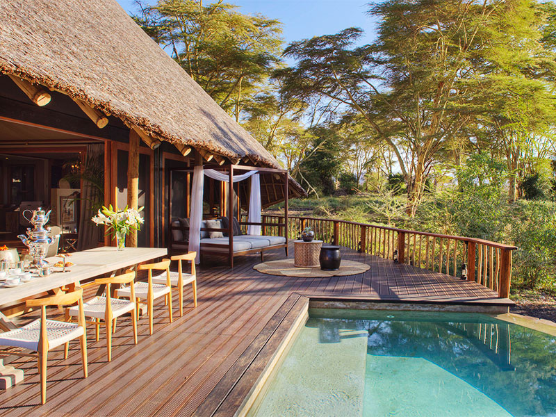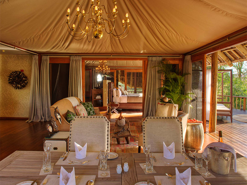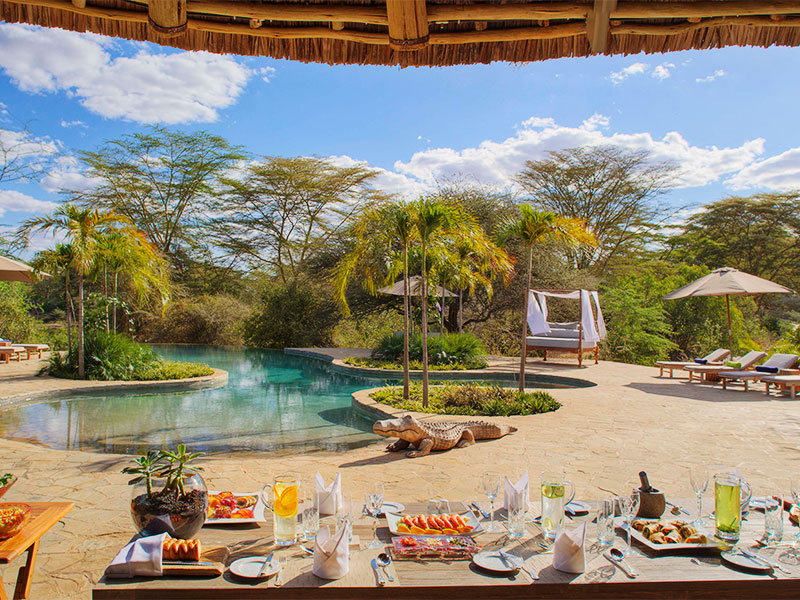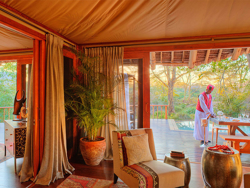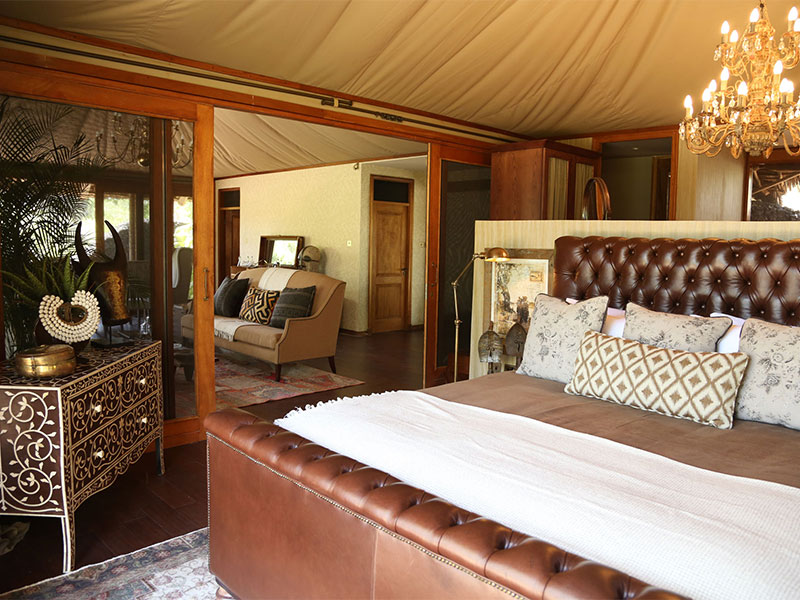 Hier in Tsavo, waar hij leefde en stierf, leeft deze traditie voort. Finch Hattons biedt accommodatie aan max. 38 gasten in grote en-suite tenten. Er is verder een sfeervolle bar, een restaurant en een zwembad met ligstoelen. Het diner bestaat uit maar liefst 6 gangen.