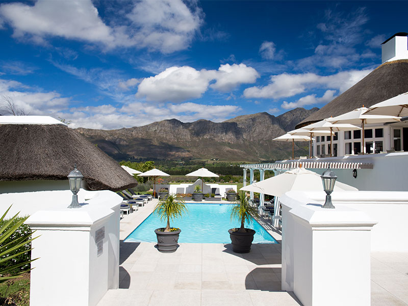 Het Mont Rochelle Hotel & Vineyard is een elegante rietgedekte villa, gelegen in de heuvels met een magnifiek uitzicht over de Franschhoek. Deze luxe accommodatie is omgeven door een grote wijngaard.