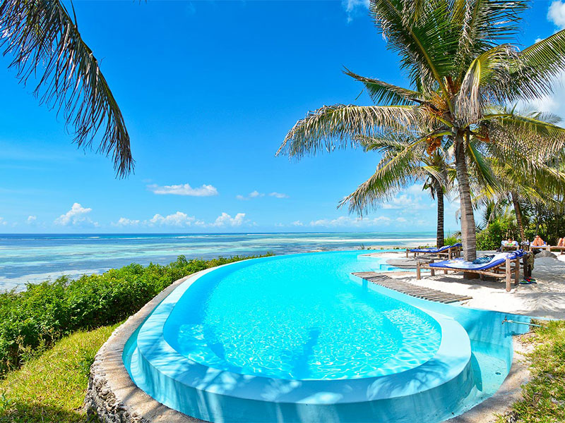 Prachtige, hoog gelegen lodge, cottages en villa’s direct aan het strand (via een trap bereikbaar), vlakbij het dorpje Kiwenga.
