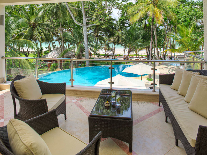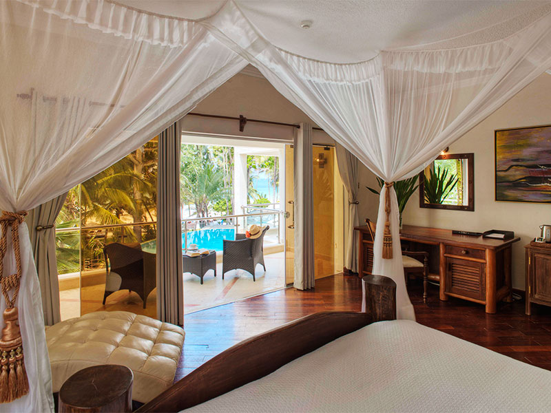 - 2 Deluxe Ocean Suites - slaapkamer met een ruime zithoek, een kaptafel, een eigen badkamer met douche, bad en dubbele wastafel, een eigen balkon met uitzicht op de oceaan. Perfect voor pasgetrouwden!