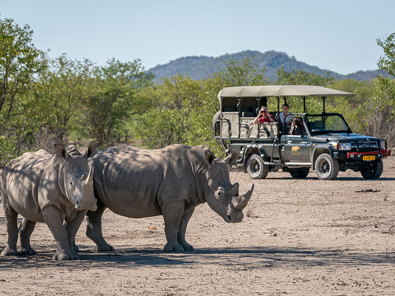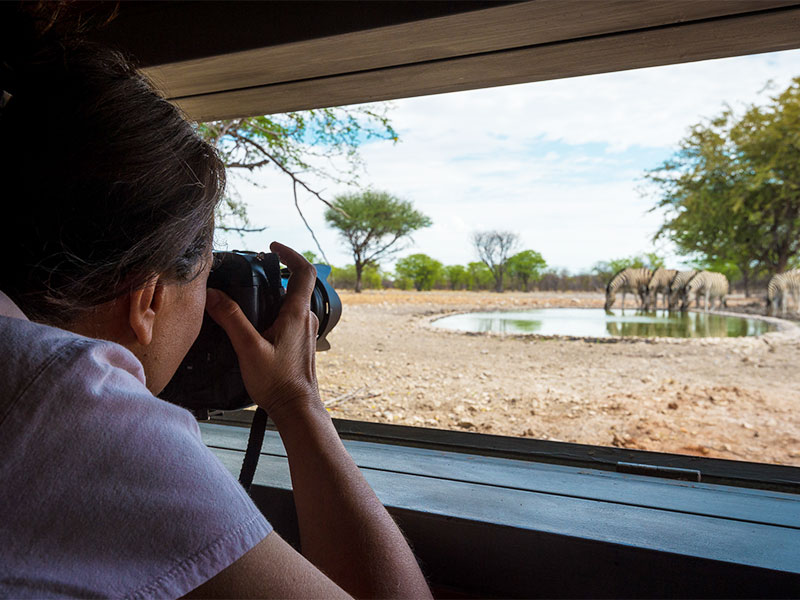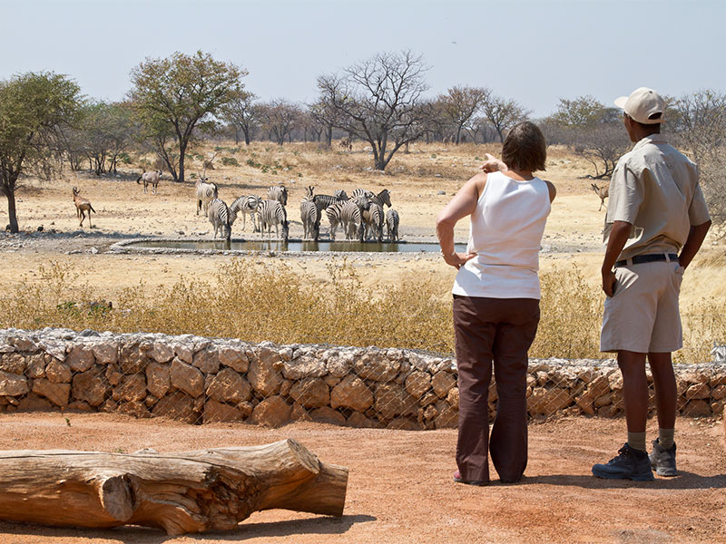 Ochtend- en middag game drives in Etosha National Park, ochtend, middag- en avond game drives (op verzoek) en wandelingen in het Ongava Game Reserve. De verzonken hide bij de waterhole aan de voorkant van het kamp is een uitstekende plek om wilde dieren van dichtbij te zien komen drinken.