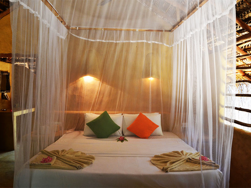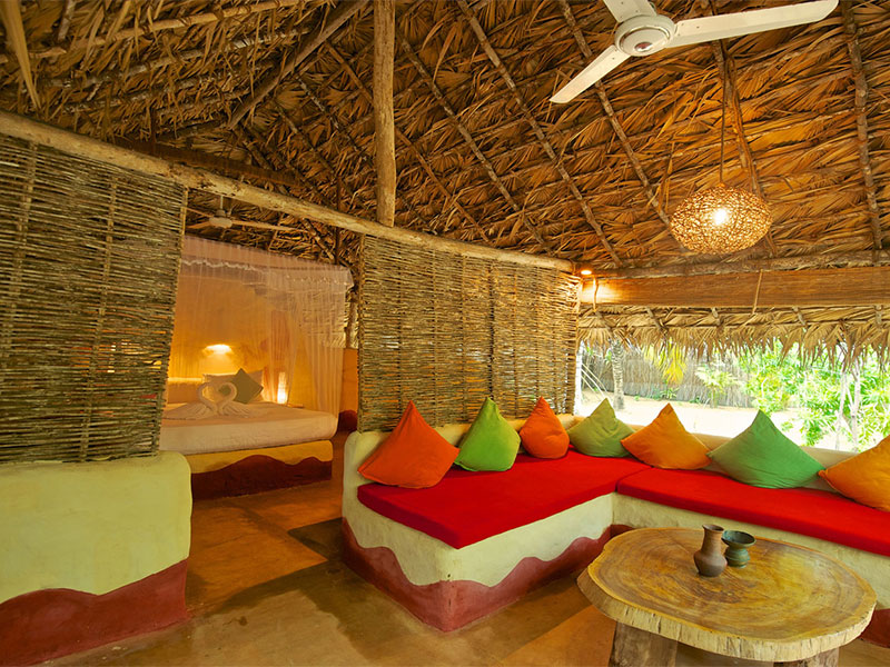 Het is één van de mooist opgezette beach resorts  in deze omgeving. Met zijn inheems geïnspireerde ontwerp bevindt elke cabana zich in een eigen tuintje. De slaapkamer met 2-persoonsbed komt uit op een veranda aan de voorzijde met een ingebouwde zithoek. De aparte badkamer met een “waterval douche” onder een kokospalm bevinden zich in de omsloten privétuin. De kamers beschikken over een thee-/koffiezetapparaat, een internettoegang, een kluisje en wifi.