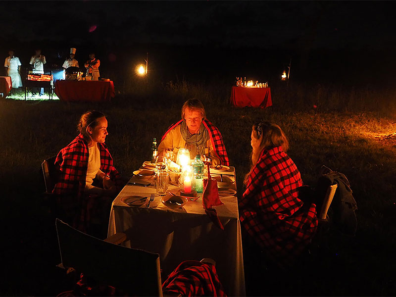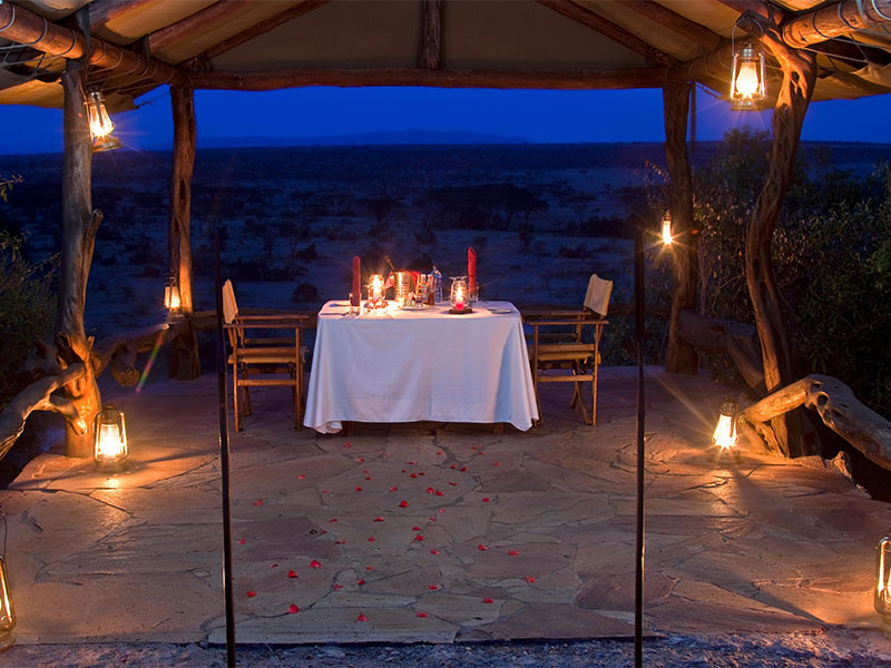 De maaltijden worden geserveerd in een verhoogde eethoek en u kunt genieten van drankjes op het terras met uitzicht op de Afrikaanse zonsondergang.