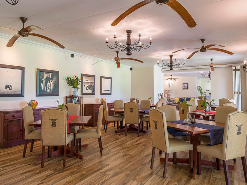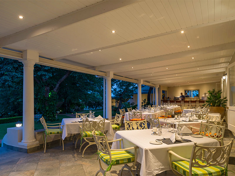 De maaltijden worden binnen of op een groot, ruim buitenterras met uitzicht op de tuin en het zwembad geserveerd. Er is een comfortabele lounge binnen met een open haard en een buiten lounge.