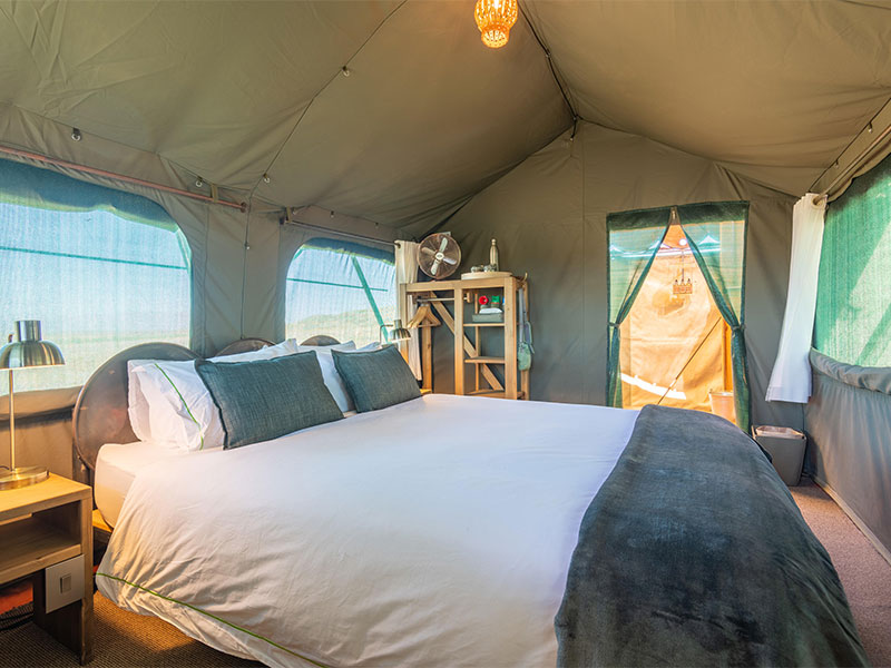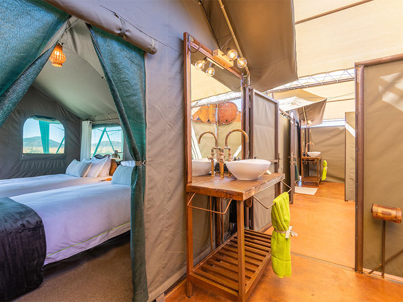 6 schaduwrijke safari tenten (waarvan 1 familietent) staan op platforms, kasten, zonne-energie voor verlichting en 220V-oplaadpunten, evenals een eigen en-suite badkamer met warme douches en Toiletten.
