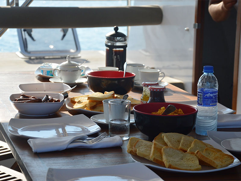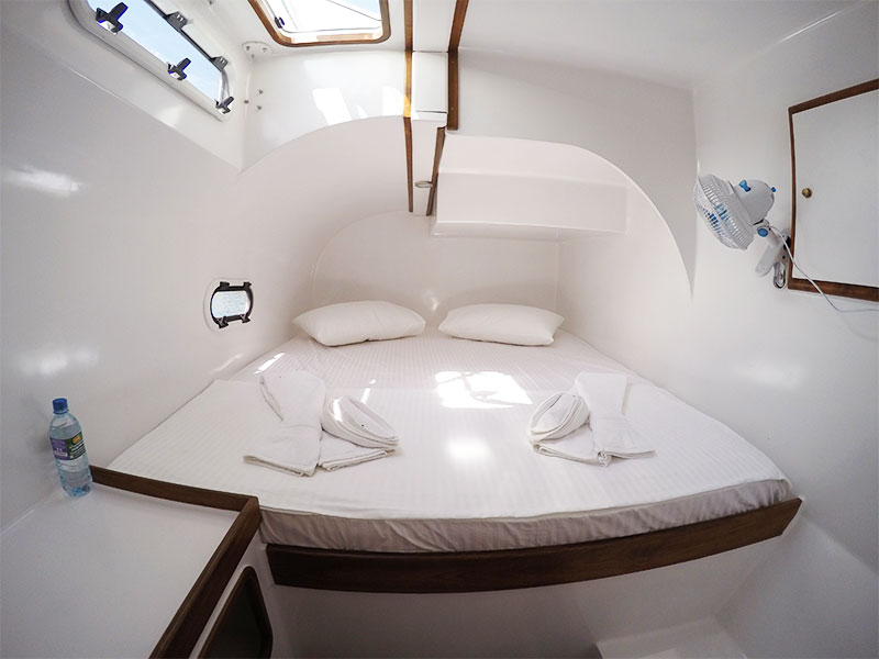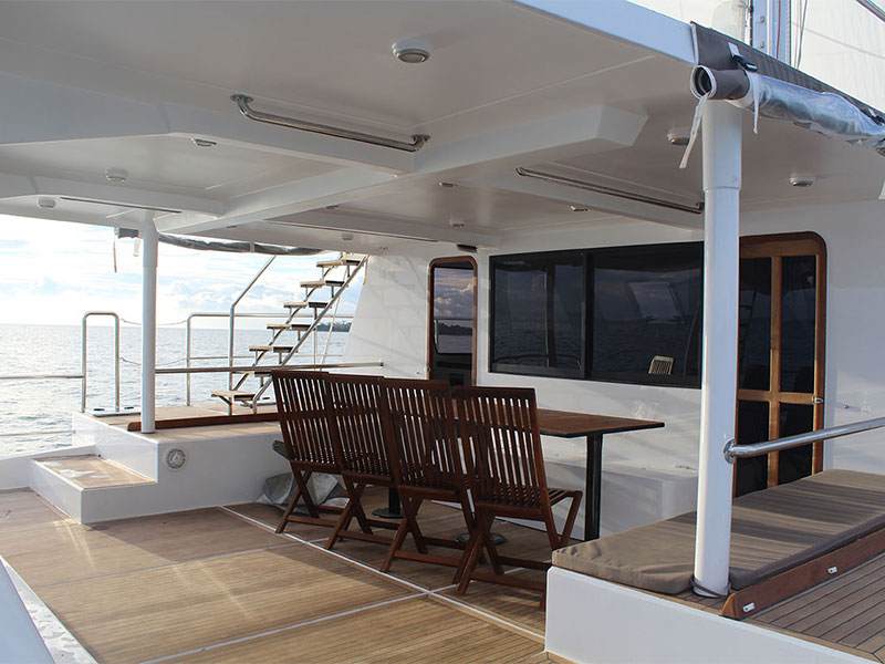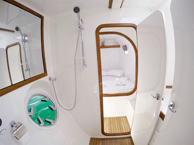 De comfortabele hutten beschikken over een eigen badkamer met toilet. Het zwemplatform aan de achterkant, de open air lounge en een volledig uitgeruste keuken die alles biedt wat een chef nodig heeft om heerlijke maaltijden op zee te bereiden, zorgen ervoor dat u optimaal kunt genieten. Ligbedden zijn verspreid over de boot en er is een overdekte ruimte beschikbaar om te dineren. Het uitzicht vanaf het bovendek is adembenemend.