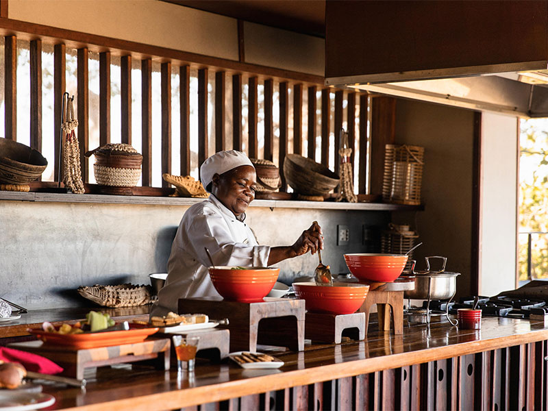 De centrale faciliteiten van het kamp omvatten een rietgedekte lounge en eetruimte, een bar uitgehouwen uit een enkele boomstam, een bibliotheek, een klein zwembad met uitzicht op de vlaktes, een vuurplaats (boma) en een kleine boetiek.