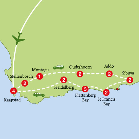 Een prachtige rondreis voor de hele familie. In 21 dagen rijdt u in een huurauto vanaf Kaapstad langs de kust via de Tuinroute naar Port Elizabeth en via Route 62 door het binnenland terug. Onderweg is er een grote verscheidenheid bezienswaardigheden en optionele activiteiten, zowel cultureel als actief. U gaat ook op game drive in het Sibuya Game Reserve op zoek naar de de Big 5.