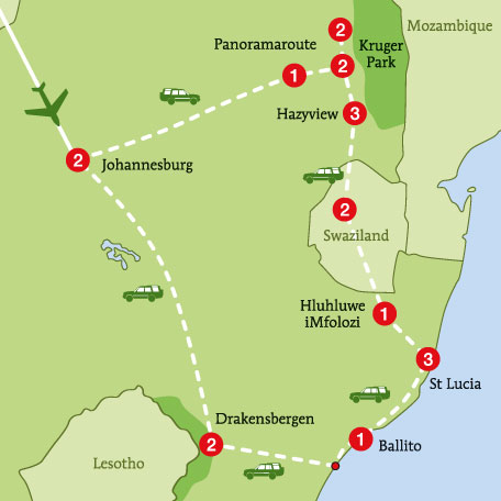 Ontdek met de hele familie de watervallen en de prachtige vergezichten van de panoramaroute, slaap in een boomhut en ga op game drive om de Big 5 te zoeken. U rijdt vervolgens via Swaziland naar de kust om via de Drakensbergen terug naar Johannesburg te rijden.