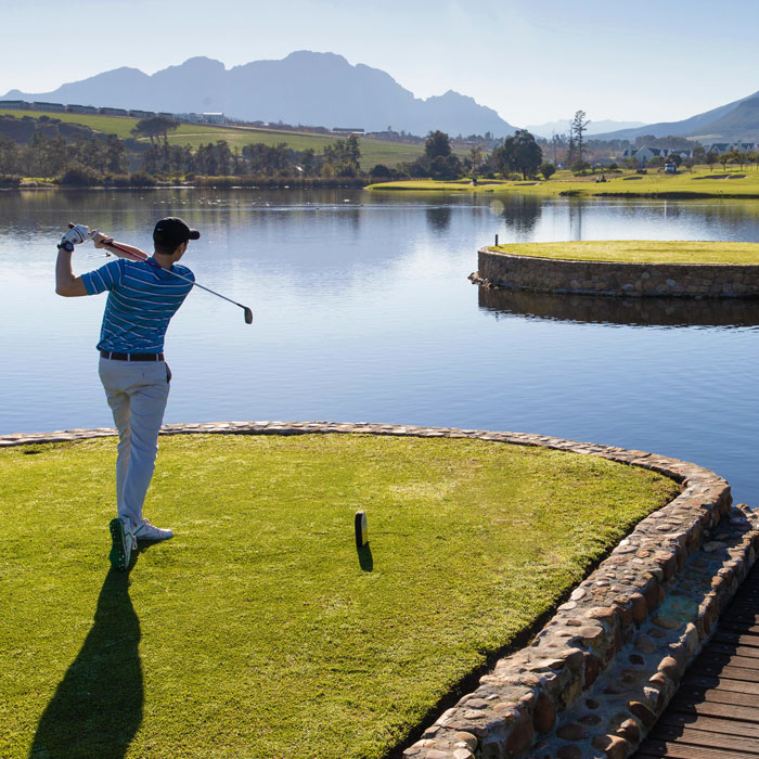 De Zalze Golf Club is ontworpen door de beroemde golfarchitect Peter Matkovich. Deze 18-holes kampioensbaan ligt in Stellenbosch prachtig tussen de wijngaarden. De Blaauwklippen rivier, omzoomd door eikenbomen, slingert zich een weg door het uitgestrekte park van de Golf Estate en komt op sommige plaatsen ‘in het spel’. De golfbaan heeft een aantal mooie waterpartijen en vooral hole 13 is een uitdaging: de afslag ligt in een meertje! Het is geen eenvoudige baan: water, enorme fairways en bunkers maken het de speler moeilijk. Spectaculair is de op een eiland gelegen tee-off.