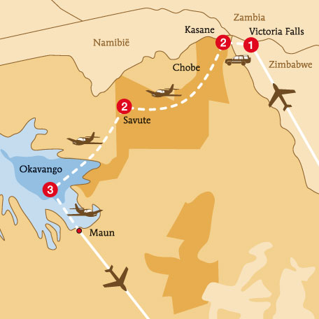 Geheel verzorgde fly-in safari naar de Victoria watervallen in Zimbabwe en naar Chobe National Park en de Okavango Delta in Botswana.