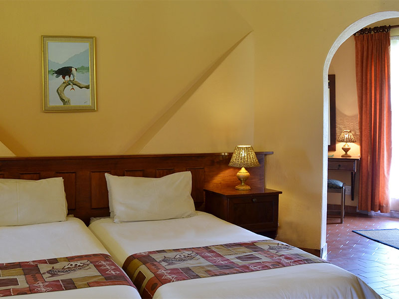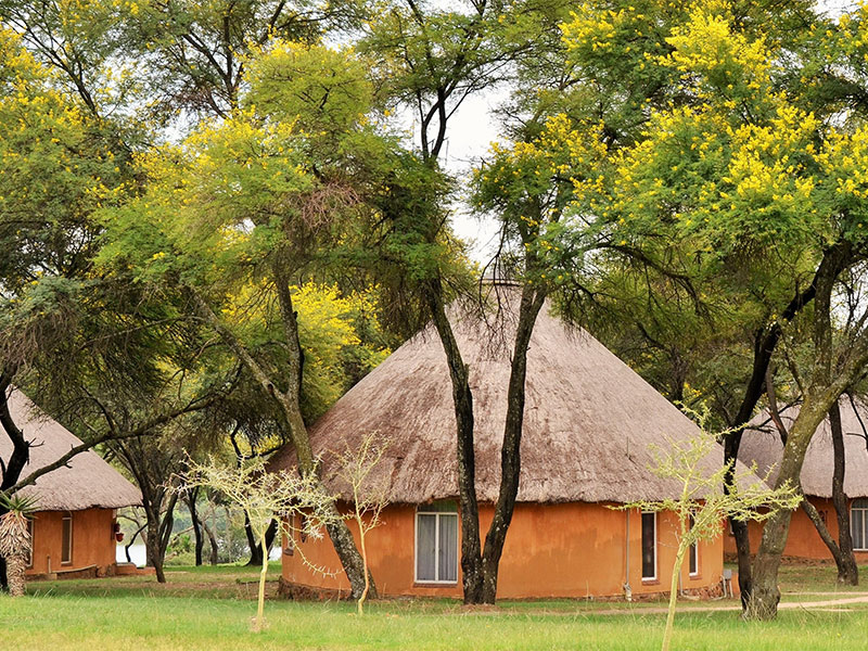 De 50 traditioneel vormgegeven rieten bungalows hebben 2 slaapkamers en zijn voorzien van koffie- en theezetfaciliteiten, een zitje, WiFi, verwarming, een en-suite badkamer met een bad en douche en een terras waar u onder het genot van een drankje kunt genieten van de glorieuze Afrikaanse zonsondergang. In de huisjes is geen TV.