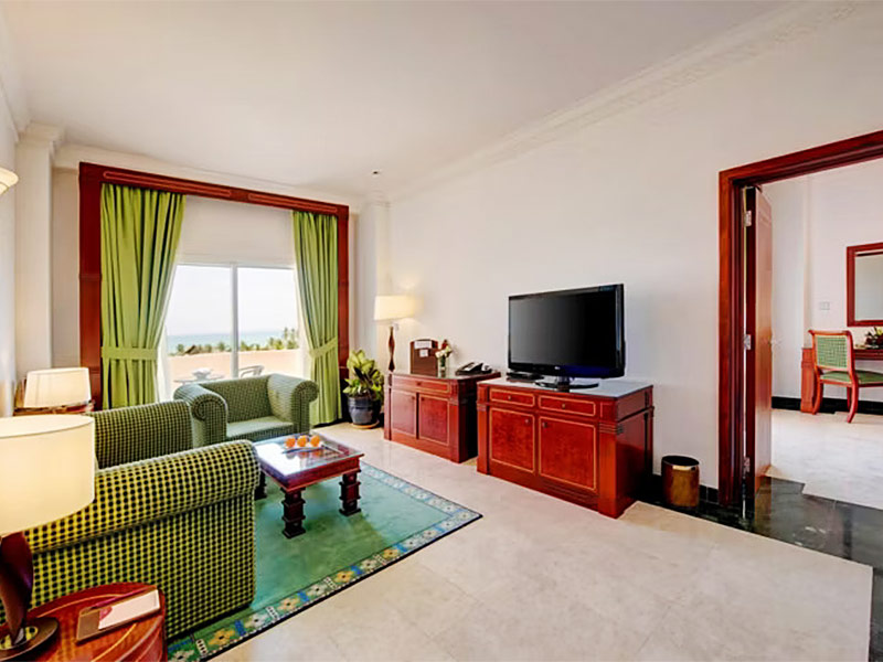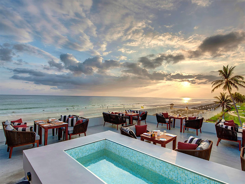 Het resort ligt aan een uitgestrekt privéstrand, omgeven door weelderige tuinen en kokospalmen. Het is gebouwd in een mix van moderne en traditionele Omani architectuur, met ruime en elegante interieurs.