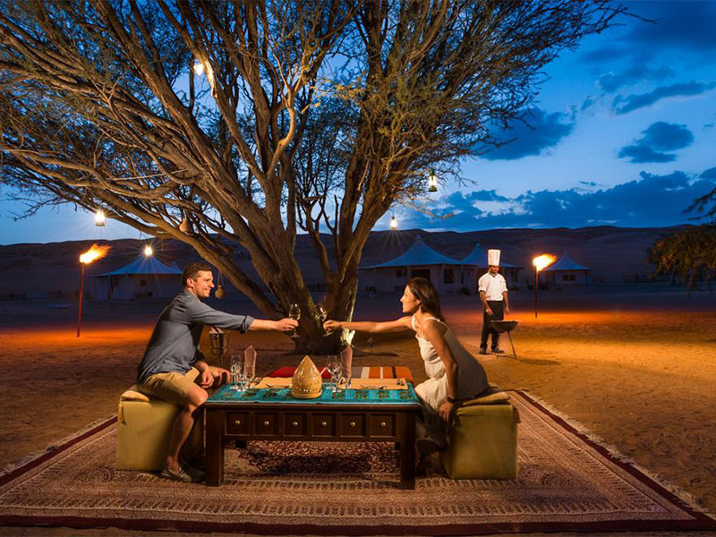 Het Two Dune Restaurant serveert de maaltijden in buffetvorm. U kunt ervoor kiezen om in comfort met airconditioning of onder de sterrenhemel in de zachte woestijnbries te dineren.