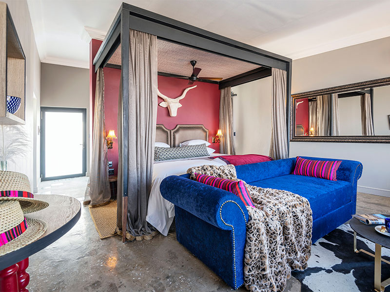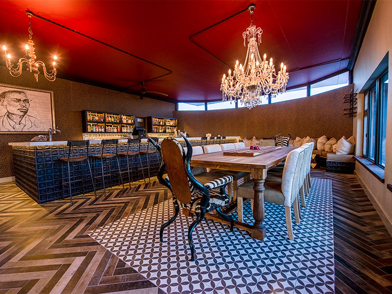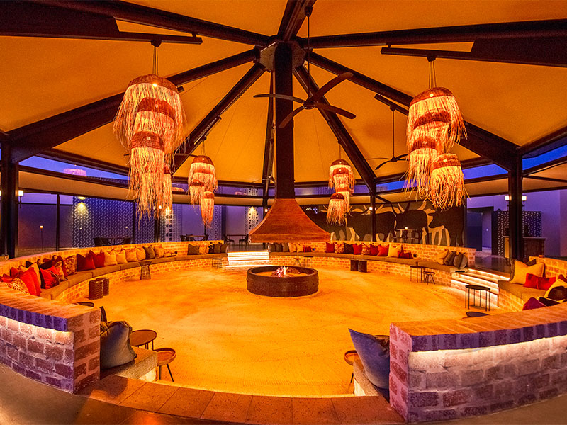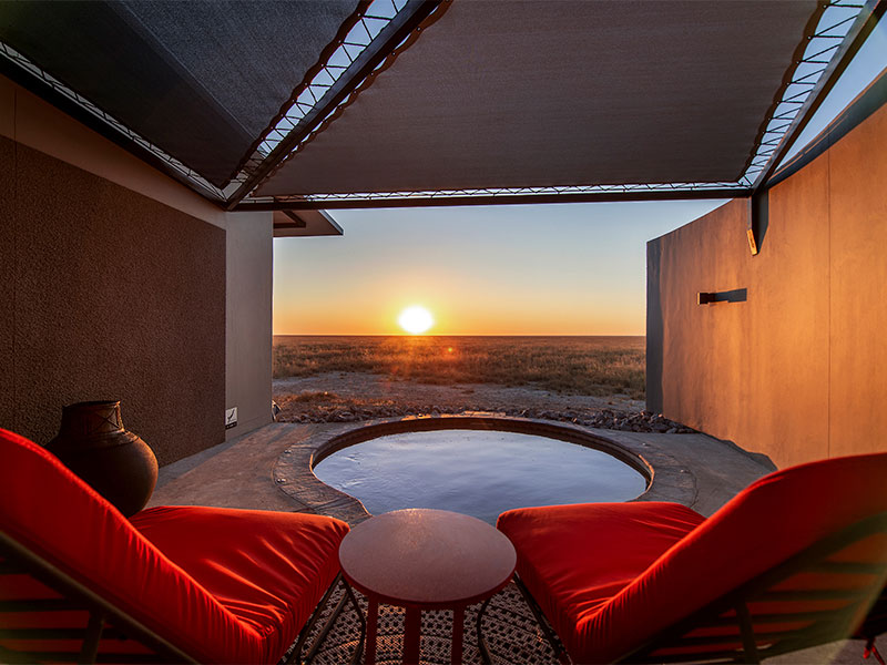De invloed van de Oshiwambo-stam komt duidelijk naar voren in de kleuren en stoffen. Alle chalets zijn ruim en stijlvol ingericht en v.v. airco/verwarming, ventilator, klamboe, kluisje, en-suite badkamer, privé veranda met dompelbad met een schitterend uitzicht op de grenzeloze horizon van de Andoni-vlaktes.