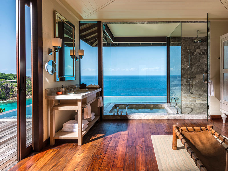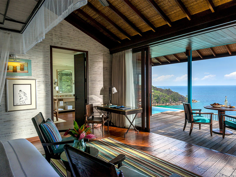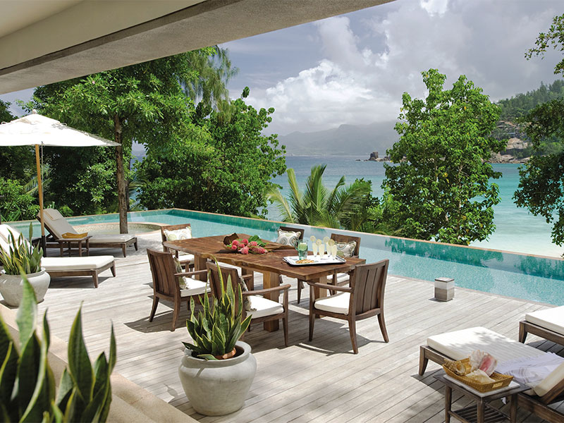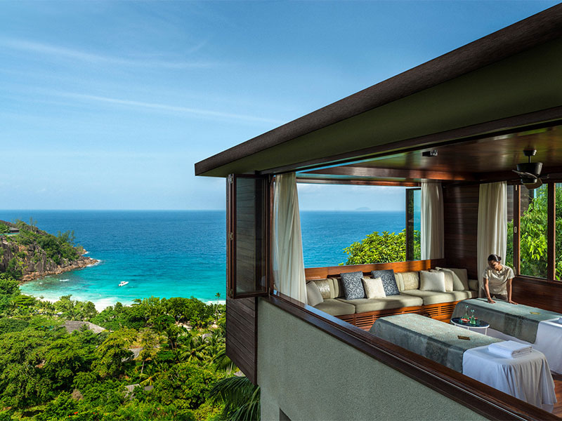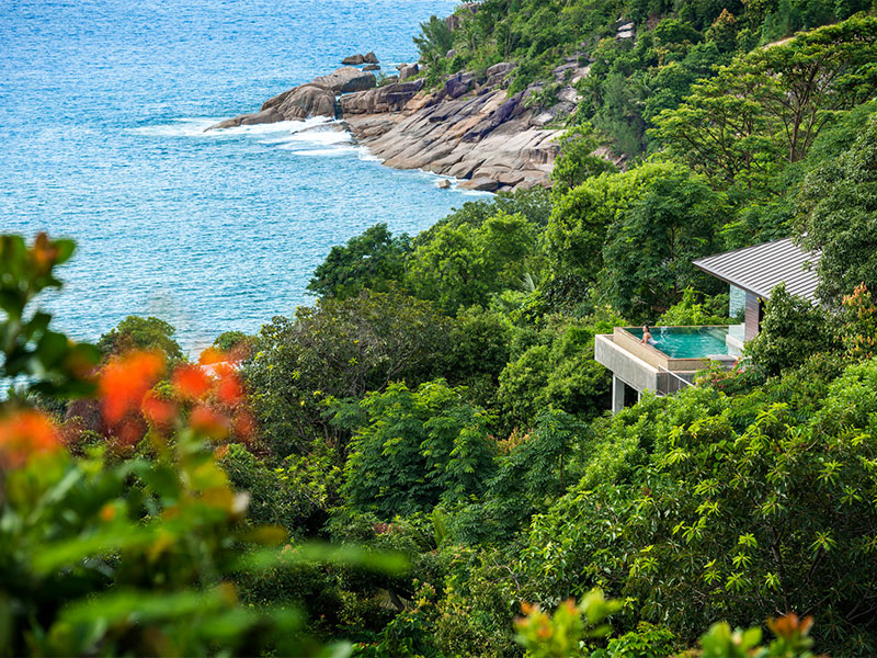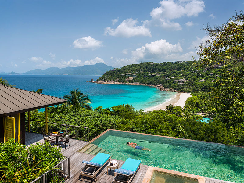 Het luxe Four Seasons Resort ligt in het zuidwesten van Mahé Island. Het resort is gebouwd tussen de tropische vegetatie, adembenemende rotsformaties en aan een parel witte zandstrand aan de azuurblauwe Indisch Oceaan.