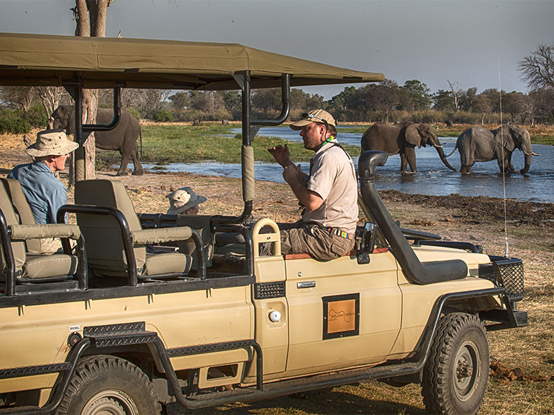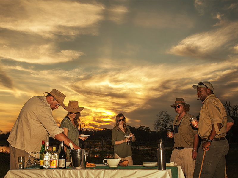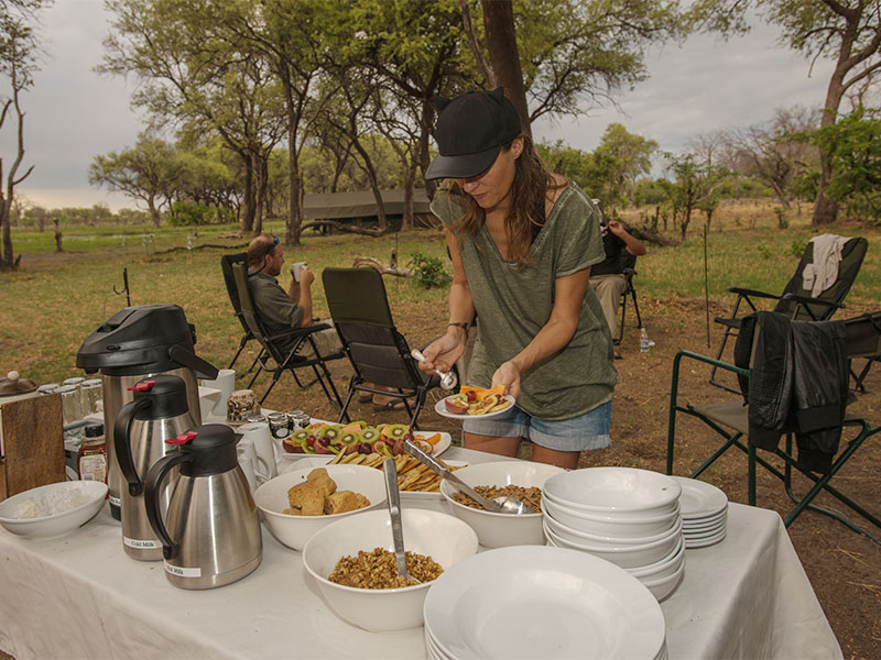 Bij het ontbijt rond het vuur worden de geluiden van de vorige nacht en de sporen van de verschillende dieren in en rond het kamp vaak gebruikt als aanwijzingen bij het plannen van game drives de komende dag.