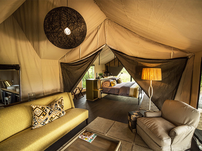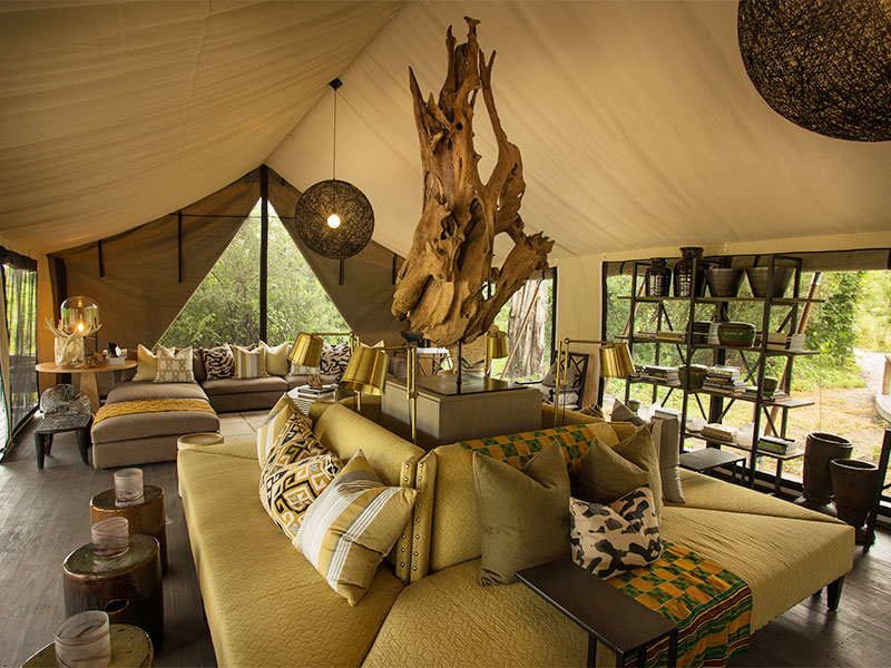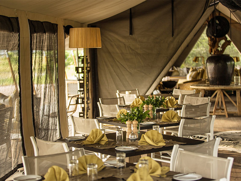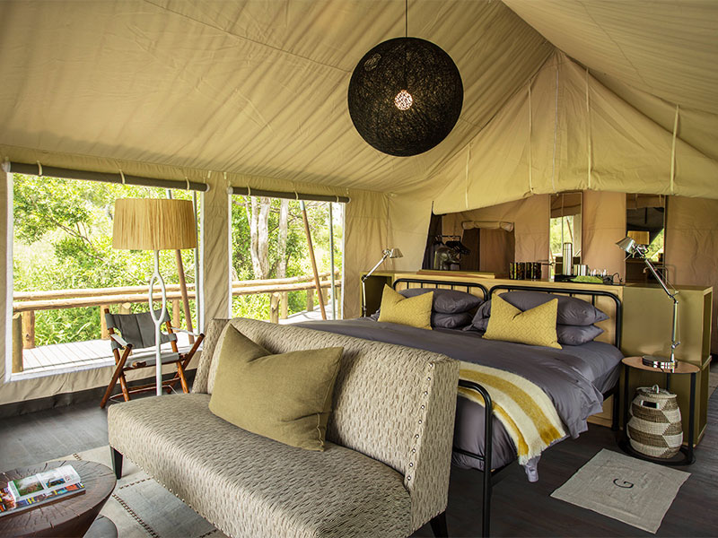 Dit kamp bstaat uit 10 luxe tenten, waarvan 2 luxe bungalowtenten en 8 luxe tweepersoons tenten, allen met een en-suite badkamer. De tenten staan onder grote, oude bomen met uitzicht op de rivier, en zijn allen voorzien van warm en koud stromend water, een binnen- en buiten douche en dubbele wasbakken. Elektriciteit in de tenten is gereserveerd voor de verlichting en het opladen van accu's en computers.