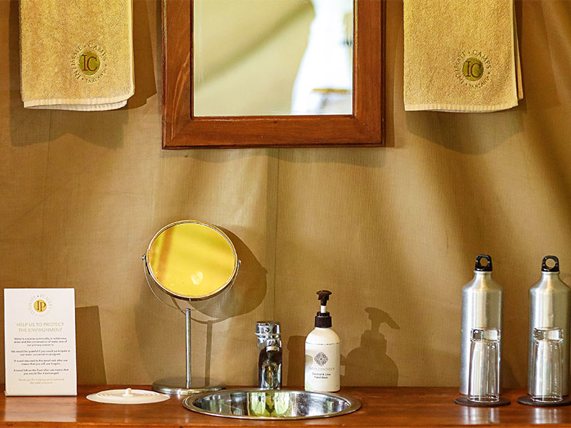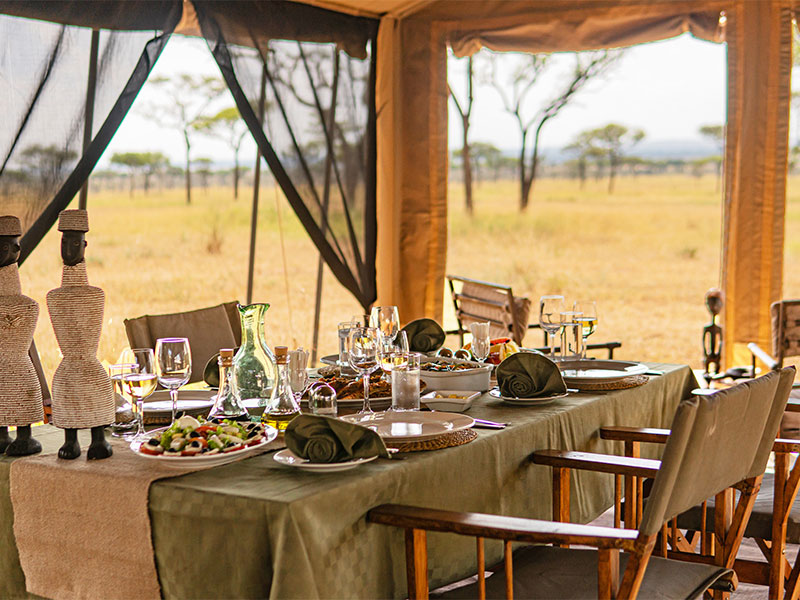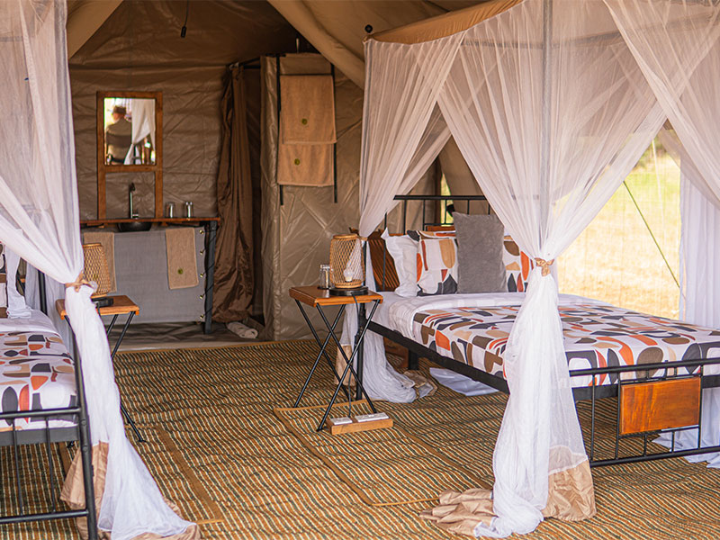De ruime tenten zijn voorzien van comfortabele bedden, een en-suite toilet en ‘safari’-douche. In de centrale tent worden maaltijden geserveerd. Deze tent is zodanig geplaatst dat u maximaal kunt genieten van het landschap tijdens uw maaltijden. Een mooi gedekte tafel met kaarslicht en goed verzorgde maaltijden maken het geheel af. ‘s Avonds kunt u met een drankje heerlijk nagenieten rond het kampvuur.