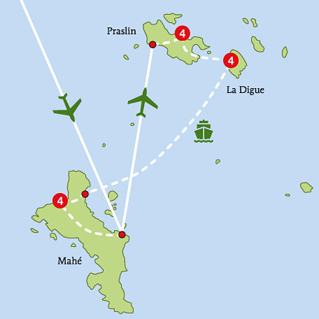 Na aankomst op de internationale luchthaven van Mahé vliegt u met een binnenlandse vlucht door naar het eiland Praslin.