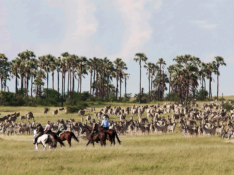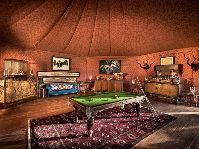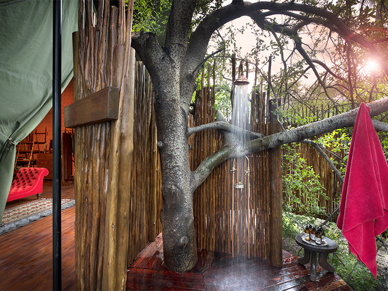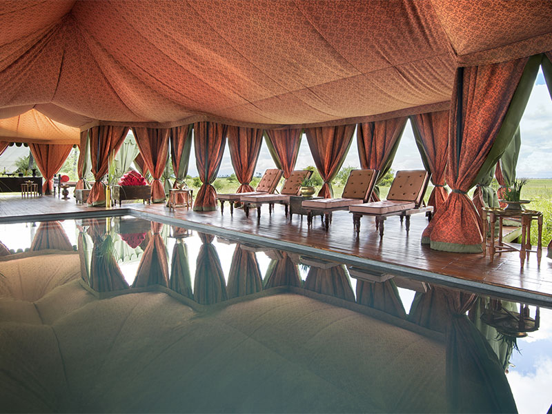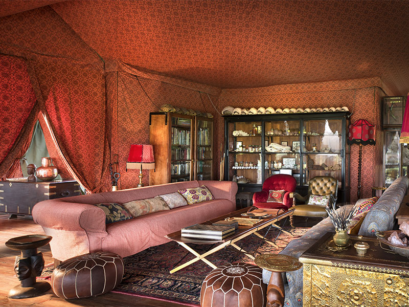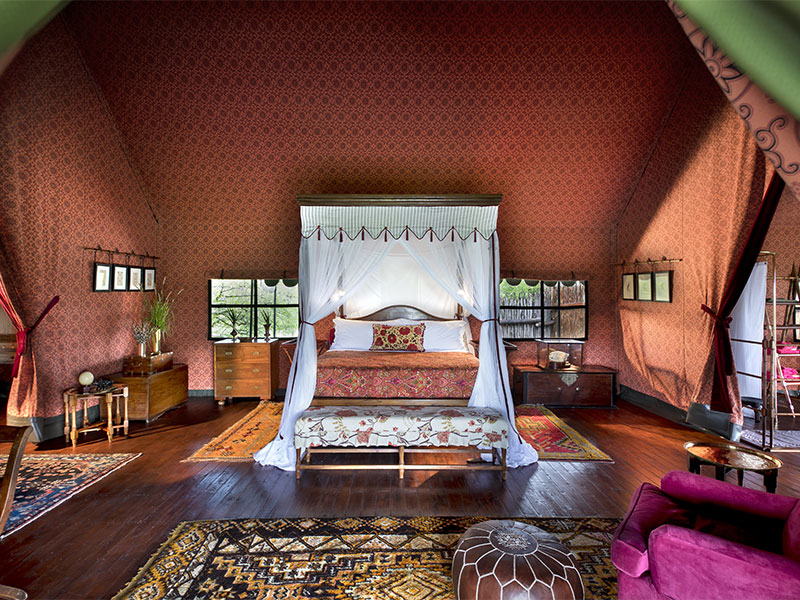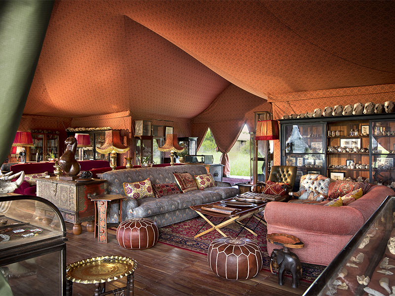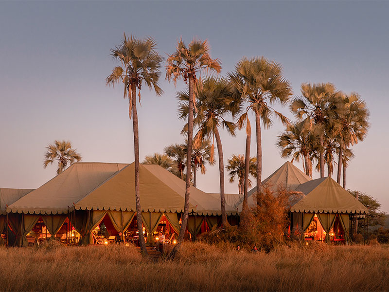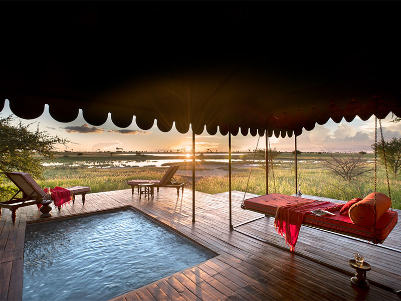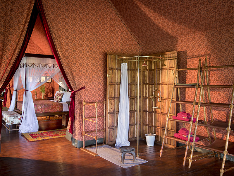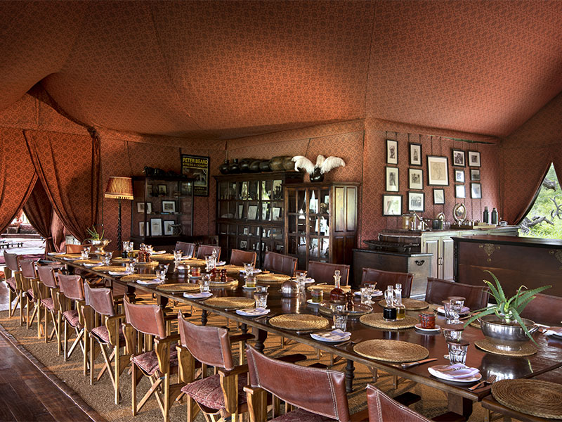 De 10 privé gelegen tenten staan tussen de palmbomen op houten platforms en zijn allen voorzien van comfortabele bedden en een koloniale inrichting. In plaats van moderne airco waaien de Afrikaanse palmbomen u koelte toe, terwijl u onder hun bladerdek in de open lucht staat te douchen. Tot u verwacht wordt voor de high tea van halfvijf.