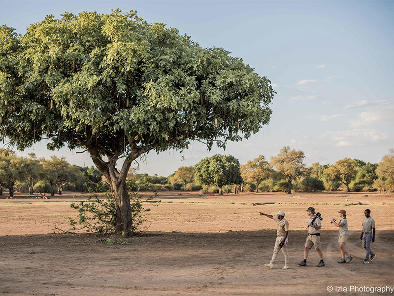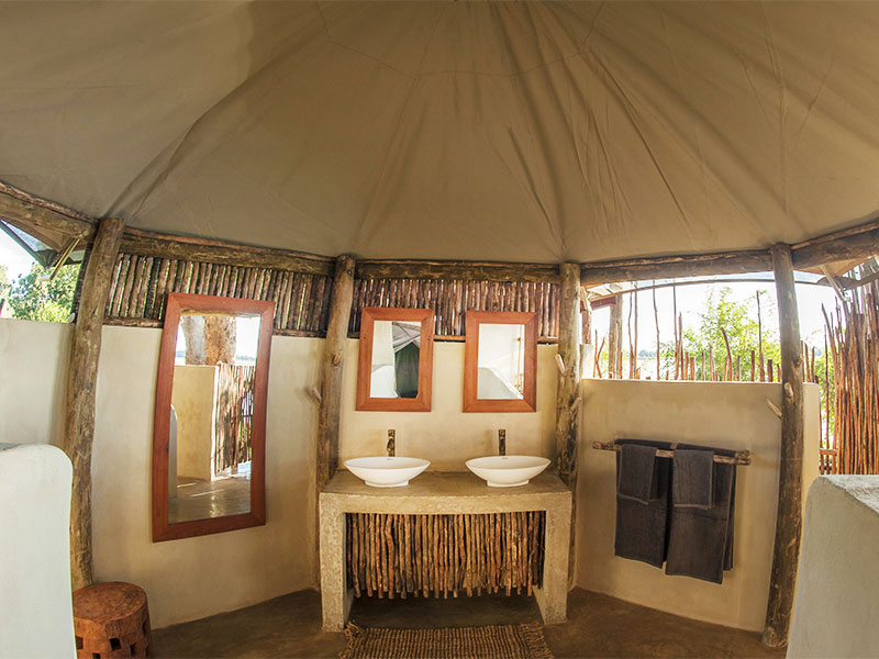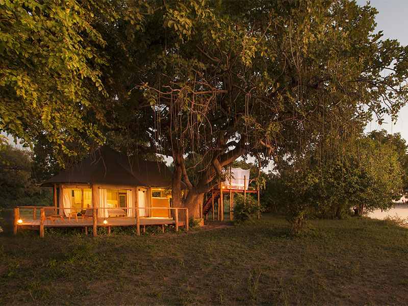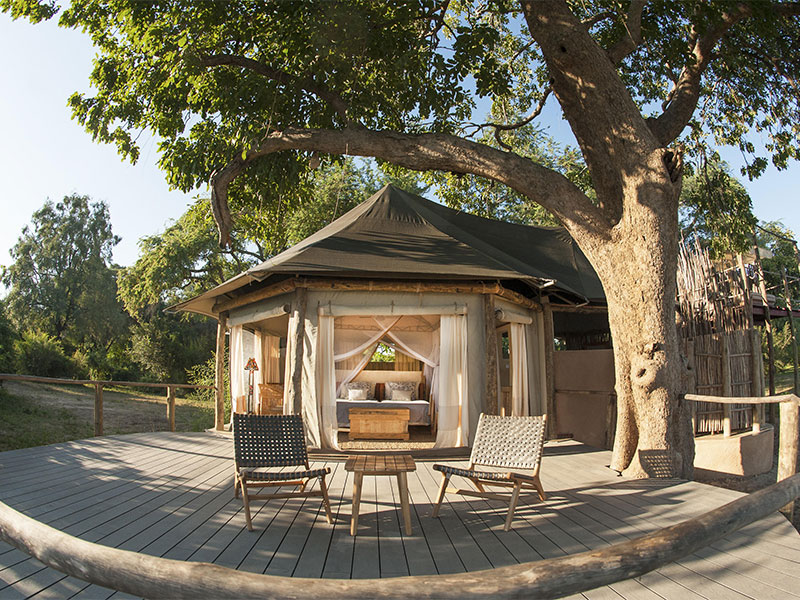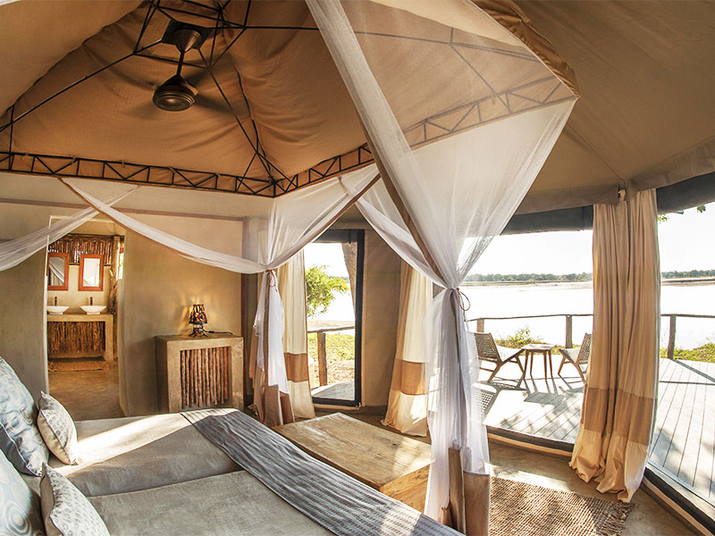 De stijlvolle tenten liggen onder de schaduwrijke sausage trees en hebben uitzicht op de Luangwa rivier of op de wildrijke lagune.