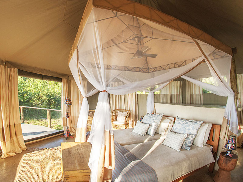 Kafunta Three Rivers Camp beschikt over 5 prachtige tenten, allen elegant ingericht met natuurlijke materialen en aardse tinten. Elke tent heeft een eigen houten dek met comfortabele stoelen om van de omliggende vergezichten te genieten. De en-suite badkamers zijn voorzien van binnen en buitendouche, dubbele wastafels en spoeltoiletten.
