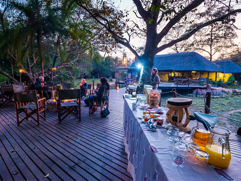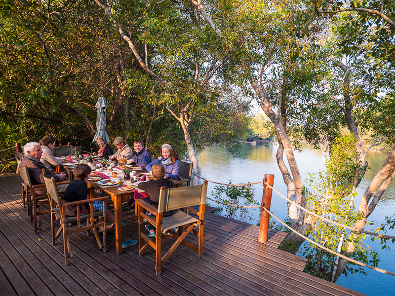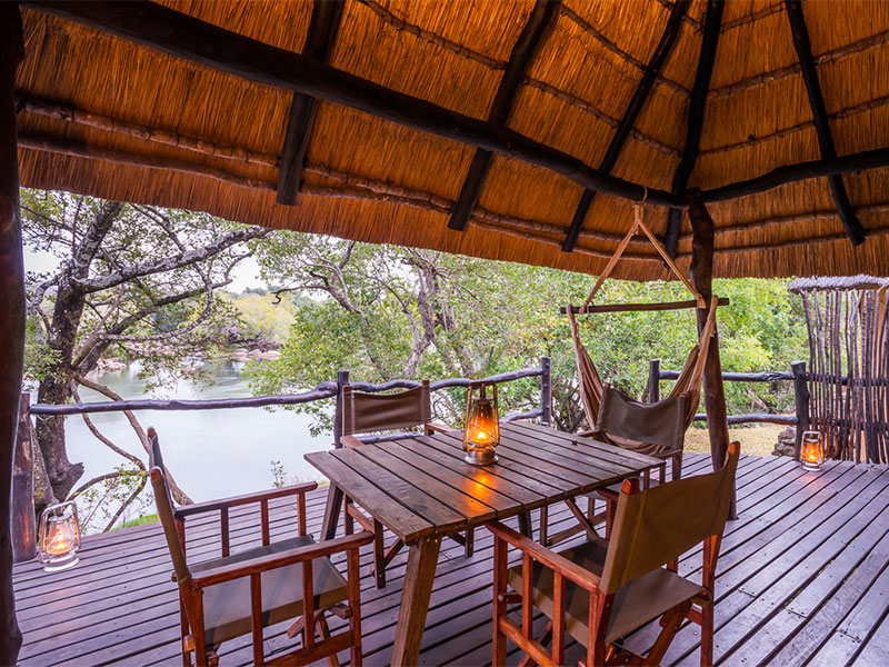 Het centrale gedeelte van de lodge (waar u uw batterijen op kunt laden) heeft een restaurant, souvenirwinkeltje en een terras met prachtig uitzicht op de rivier.