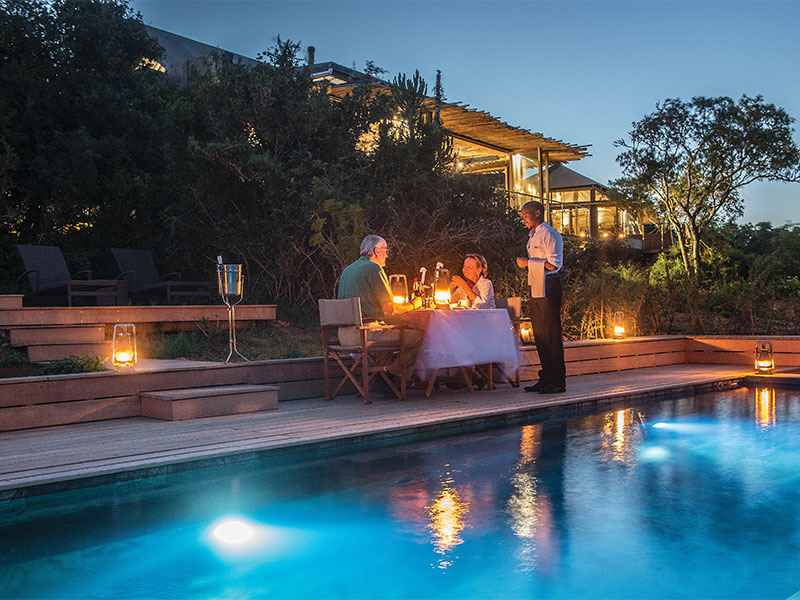 De maaltijden worden niet alleen in het restaurant geserveerd, maar ook in de boma onder de open sterrenhemel. De lodge biedt gasten ook spabehandelingen.