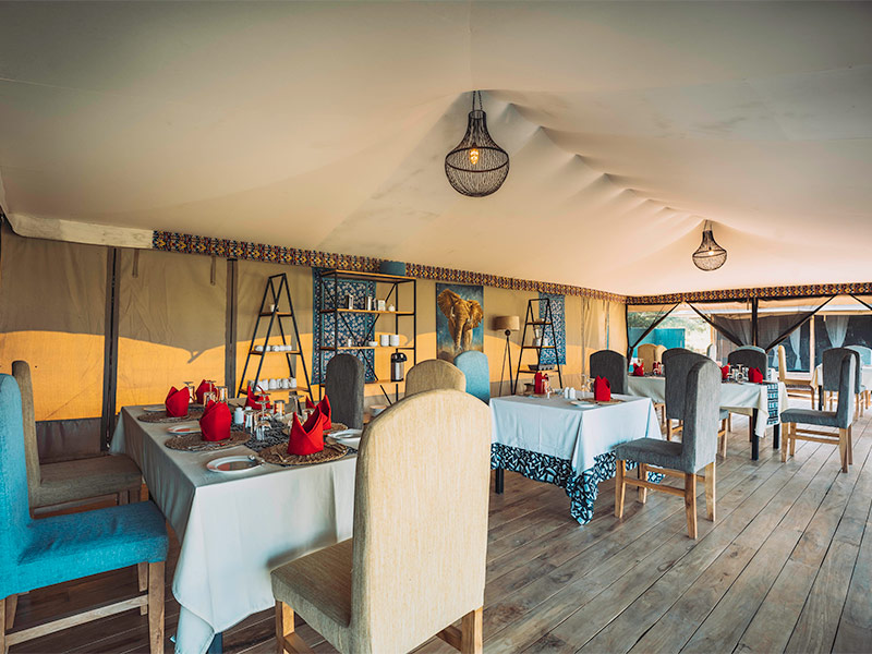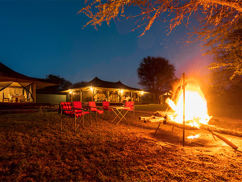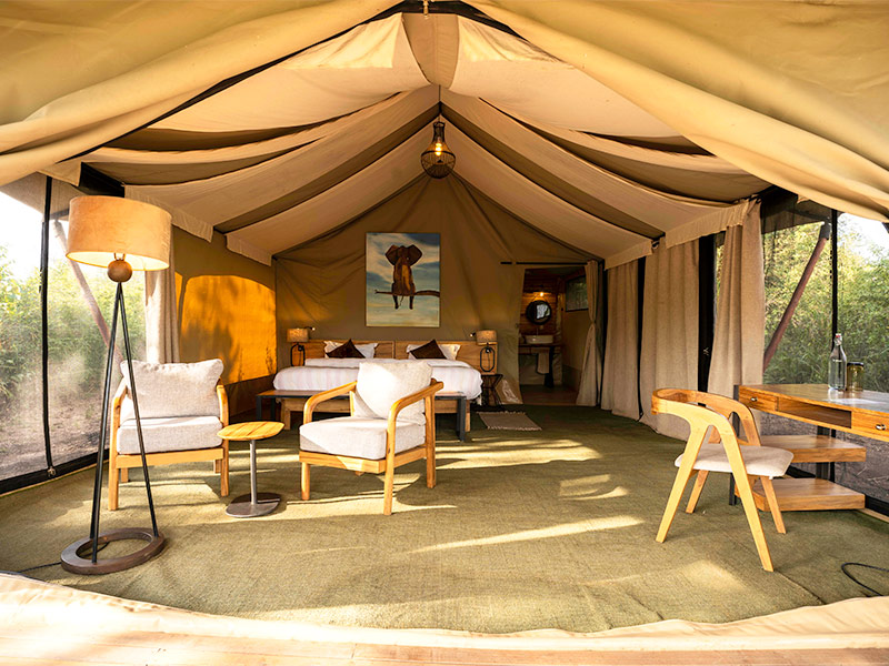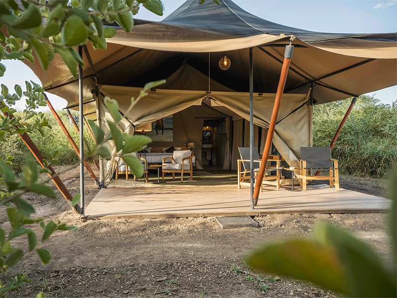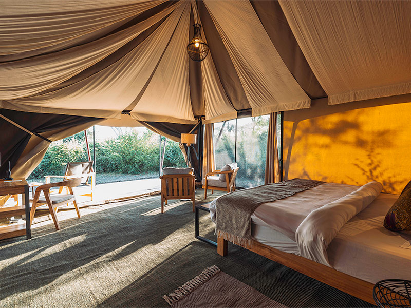 Het kamp beschikt over 9 ruime tenten en één familietent. Elke tent is voorzien van een eigen badkamer met een warme douche en een doorspoelbaar toilet. De tenten zijn uitgerust met comfortabele bedden, een kluisje, elektriciteitsaansluitingen bij het bed, badjassen, toiletartikelen en een zitgedeelte met buitenstoelen op een privéveranda.